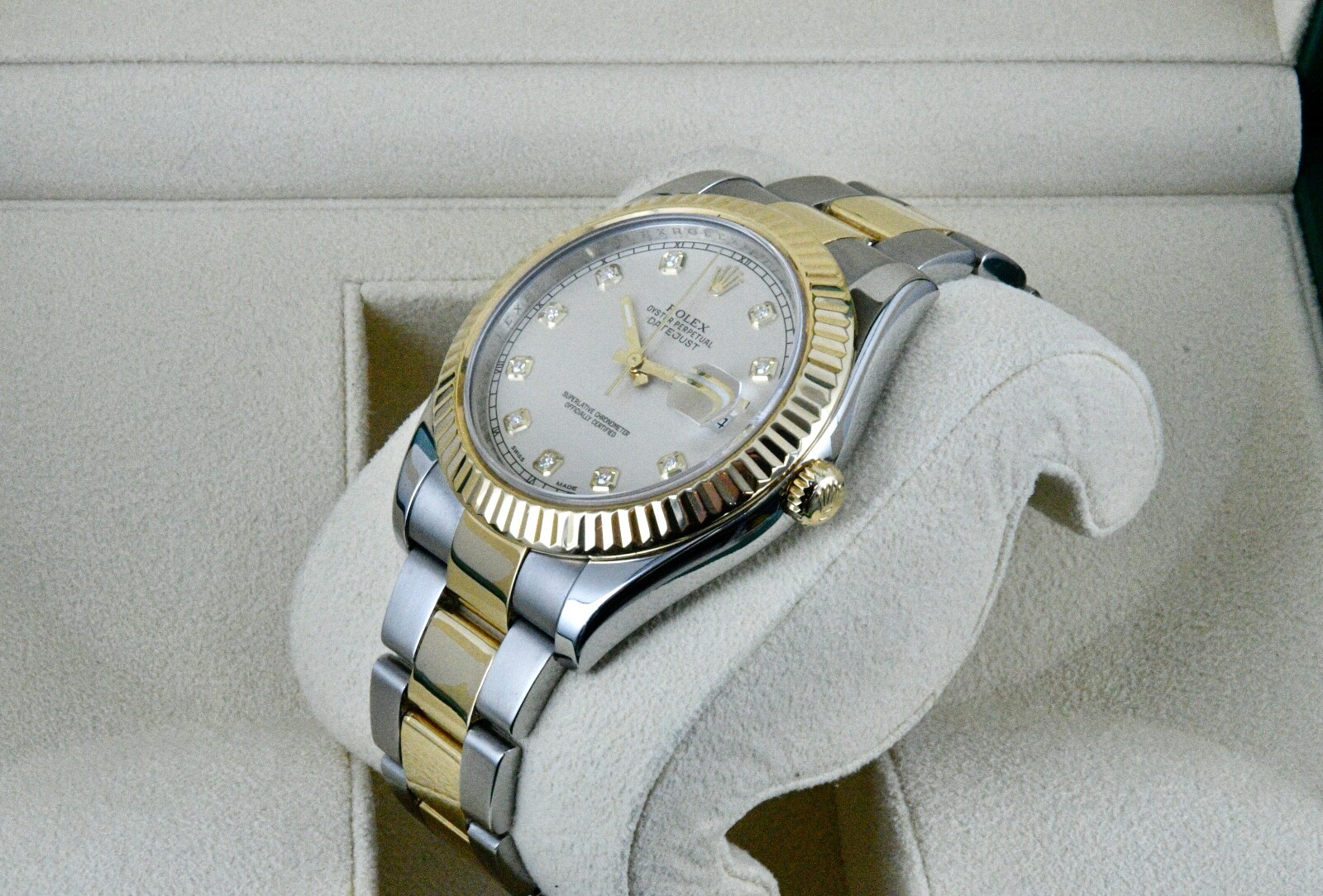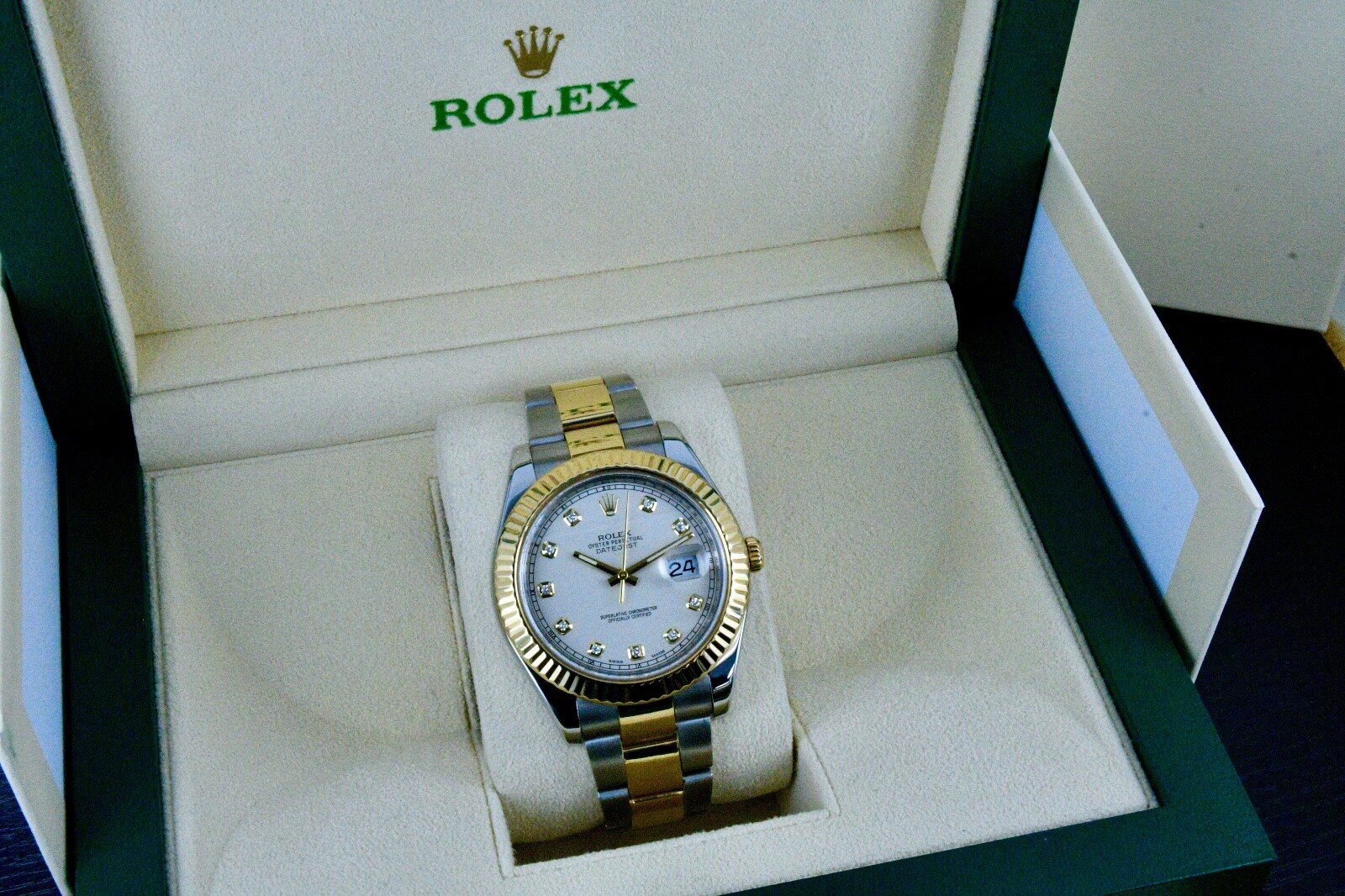 This Rolex Datejust wristwatch combines luxury and functionality, with a gold & stainless steel case and fluted bezel. The ivory ten diamond dial With date indicator, powered by a Swiss-made mechanical automatic movement. The scratch-resistant sapphire crystal and screwback case ensure durability and water resistance up to 10 meters. The 18k solid gold and Stainless steel oyster band with box in excellent preowned condition We Guarantee Authenticity on all Merchandise. We Are A Long Standing Member of the International Watch & Jewelry Guild Zeidman’s Jewelry and Loan in operation since 1923. Two locations 2669 Gratiot Ave in Detroit Michigan and 24810 Evergreen Rd Southfield Michigan WE ONLY ACCEPT PAY-PAL. AND CREDIT CARDS THROUGH PAYPAL. PLEASE SERIOUS inquiries ONLY FOR ANY FURTHER ASSISTANCE WITH PURCHASED ITEMS PLEASE CONTACT Attn. Zef WITH PROPER RETURN INSTRUCTIONS AND ADDRESS (Buyer is responsible for return shipping) We try to ship within 1 to 3 business days from the payment. Buyer pays a fixed rate for shipping and handling for the United States and International sales Payments must be made in 2 days of purchase. REMINDER : WE DO NOT SHIP TO “FPO/APO, OR ”PO BOX “LOCAL PICK UP IS ACCEPTED AND REQUIRES THE CUSTOMER TO PAY 6% SALES TAX OF TOTAL AMOUNT AT THE TIME OF PICK UP” ONLINE ITEMS ARE NOT ELIGIBLE FOR ZEIDMAN’S UPGRADE AND TRADE IN POLICY Thank You