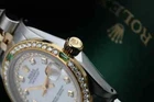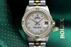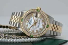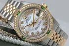 Rolex Datejust 31 mm White Mother Of Pearl Dial Two Tone Watch Emerald & Diamond Brand: Rolex Series: Datejust Model: 68273 Case Diameter: 31 mm Bracelet: Jubilee band; 18k yellow gold & stainless steel Bezel: Custom set diamond/emerald, 18k gold plated Dial: Custom set white mother of pearl diamond dial Carat Weight: 1.46 carats in total diamond weight The sale includes a jewelry watch box and an appraisal certificate which states the watch's credentials Attached to the appraisal certificate is our 1 year mechanical warranty and lifetime diamond replacement warranty Diamonds are set aftermarket not originally by Rolex