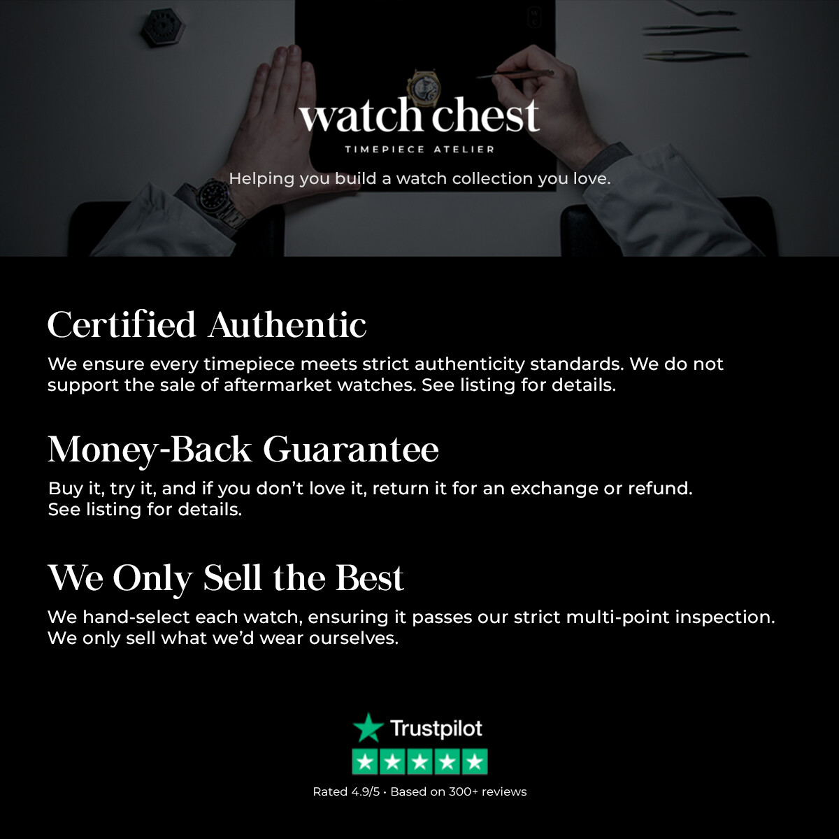 This by far has to be the best experience I have ever. From start to finish the watch chest team did a fantastic job communicating with me, following up via email with additional details, and making themselves available. My watch was beautifully shipped without a single scratch, or even damage to the box. My item was shipped promptly and even came with a beautiful cleaning cloth that I’ve already put to good use! Excited for future purchases with the watch chest. I highly recommend watch chest!