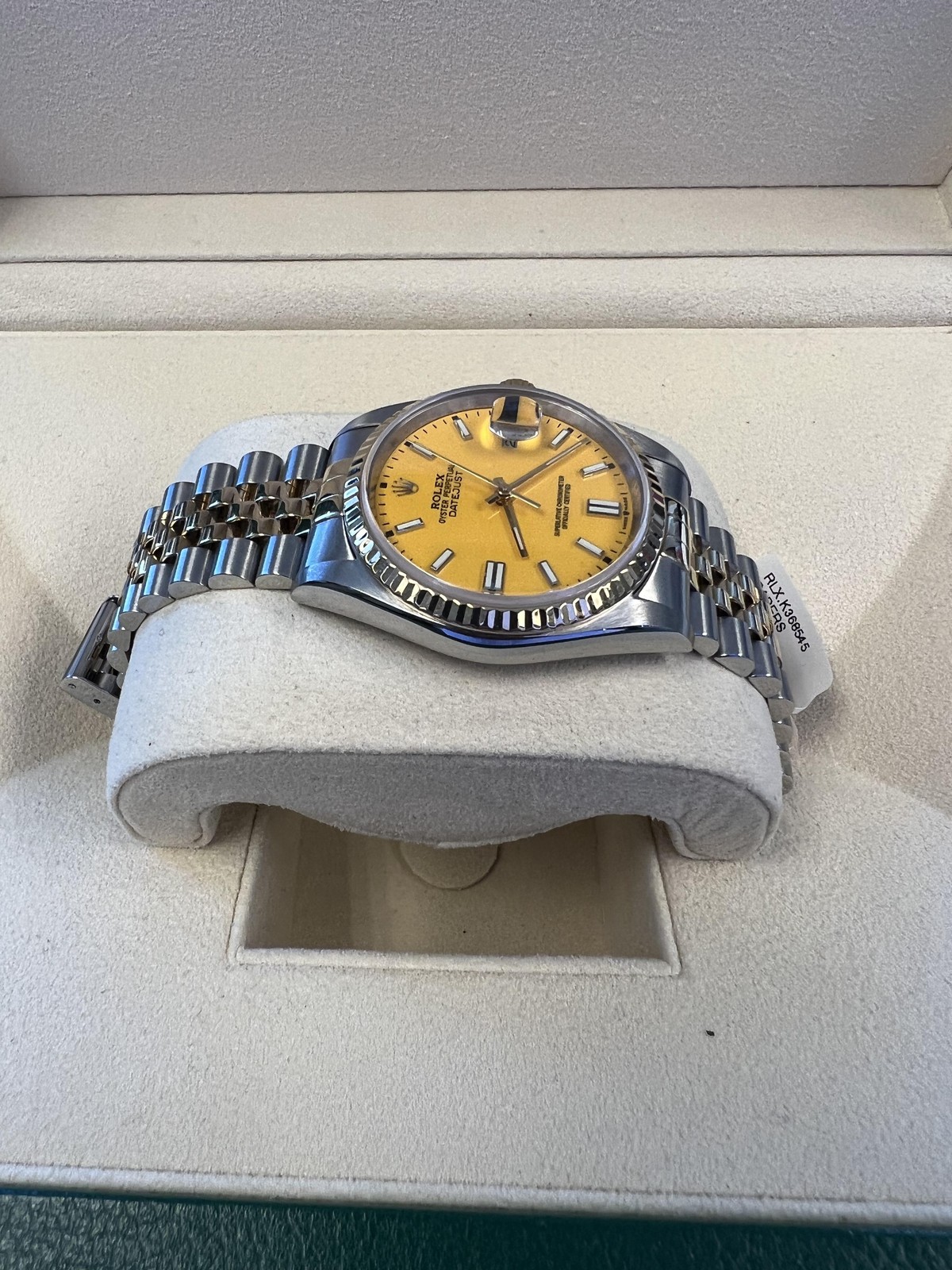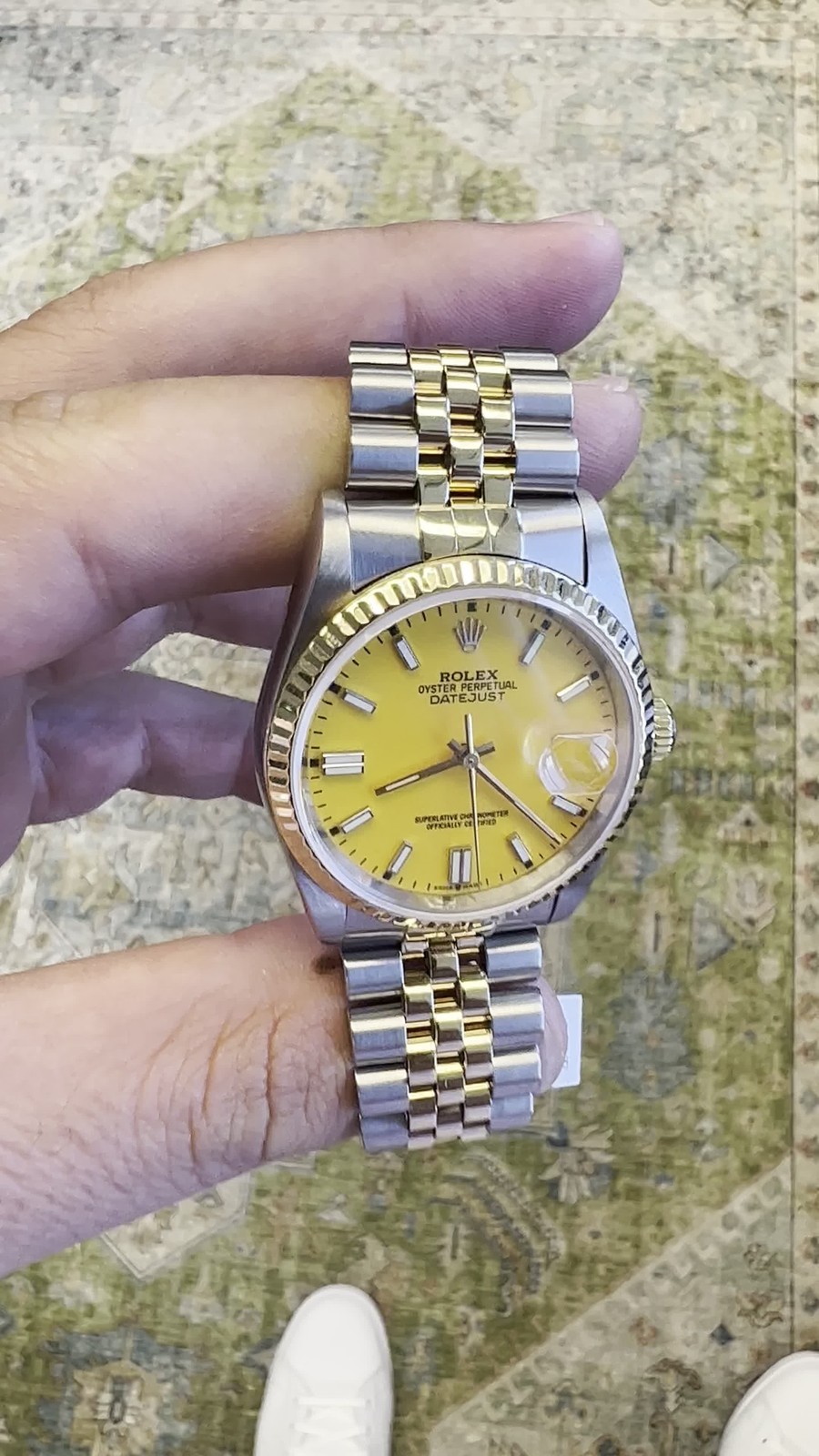 BRAND: Rolex MODEL: Datejust REFRENCE: 16233 SIZE: 36mm CASE: 18k Yellow Gold and Stainless Steel DIAL: Yellow BEZEL: 18k Yellow Gold BAND: Jubilee 18k Yellow Gold and Stainless Steen WRIST SIZE: Apx 7.25 MOVEMENT: Automatic Custom yellow dial Mint condition, re-polished Box & papers Accommodated with an up-to-date digital appraisal once purchased, upon request. Please contact us with any questions. Thank you. Item Number WM2345