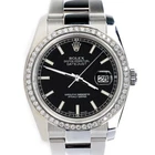 Fast free domestic shipping elegantswiss warranty easy returns | money back guarantee Rolex Datejust 36MM Black Stick Dial Steel Oyster Watch with Custom VS1 Diamond Bezel 116200 Rolex Datejust 36mm Stainless Steel oyster Watch, ref #116200. Factory black stick dial. Custom 1.1ct VS1 diamond bezel (diamonds are not set by Rolex). Excellent, pristine condition, no signs of wear, works flawlessly, comes with Rolex box, certificate of appraisal, Elegant Swiss Three year warranty, and LIFETIME individual diamond replacement warranty. The watch is running strong and keeping accurate time, having been timed to precision on Witschi Expert Timing Machine. Stock: ESF302250701 Wrist Measurement Guide Reviews SKU ESF302250701 Brand Rolex Model Datejust, ref #116200 Movement Rolex Swiss automatic (self-winding) Bezel Custom VS1 FG genuine diamond bezel Case Stainless steel Case Diameter 36mm Dial Factory black stick dial Gender Men's/Unisex Condition Excellent, pristine condition, no signs of wear, works flawlessly. The watch is running strong and keeping accurate time, having been timed to precision on Witschi Expert Timing Machine. Strap / Bracelet Rolex stainless steel oyster bracelet Warranty Three Year ElegantSwiss Warranty and LIFETIME Individual Diamond Replacement Warranty Functions Hours, minutes, seconds, date Box Rolex box Papers Certificate of Authenticity/Appraisal Why Trust ElegantSwiss Watch Co? At ElegantSwiss Watch Co, the client experience is our top priority. We sell luxury pre-owned and unworn watches worldwide and need to ensure complete customer satisfaction. We want our clients to enjoy the experience of choosing their luxury watch. Our experts handle all inquiries with utmost care & handle them in the shortest time possible. Feel free to call or text us via phone or eBay messaging if you have any questions about any item listed, or if you're looking to sell/upgrade your current watch. Thank you for your continued support and for shopping with ElegantSwiss Watch Co. Time doesn't stop, but we set the tempo. For some, the day flies by in a blink of an eye, for others a minute may seem an eternity. Here at ElegantSwiss, we help you find that perfect timepiece to help in your travels through the span of time. We also provide professional and experienced service and repair for all of your needs. Authenticity Guaranteed WE GUARANTEE ALL WATCHES to be 100% authentic. We do not sell any forged, fake, or suspect watches that we could not guarantee beyond any doubt to be authentic. Located in the world famous Diamond District of NYC, ElegantSwiss Watch Co continuously provides up-to-date service to thousands of our happy customers. SHIPPING We ship via FedEx with Signature Confirmation and insure for full value against theft, loss, or damage while in transit. For security of our customers and to prevent fraud, every item is sent/received under HD video surveillance, with all serial/reference numbers on file. International customers should contact local Post Office/Customs Office for information concerning import duties/taxes. Returns No Hassles, No Questions, No Reasons Needed, just contact us and return it so we receive it back within 30 days. We won’t make you wait months to see the credit or refund. We process all of our returns each weekend and your account will be credited no later than 3 business days of that weekend. Also, unlike most retailers, we will not deduct a restocking fee. We will refund 100% of your payment. Please make sure the item is shipped to us in the exact same condition in which it was shipped to you, with security tags/tapes attached. Warranty Watch movements are warrantied to perform as described in the ElegantSwiss item description during the warranty period. Damage to the watch due to accident, neglect or mistreatment is not covered, nor is the loss or theft of the watch or any damage done by loss or theft. Damage caused by fire, pressure, water, or natural disaster is not covered. Repairs, alterations, tampering, substitution and/or addition of parts, custom work and/or modification of any kind done without prior written consent from ElegantSwiss and not performed by ElegantSwiss will void this warranty. This warranty replaces the original manufacturers warranty.