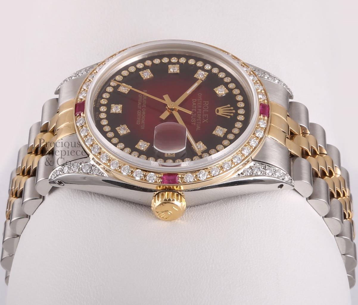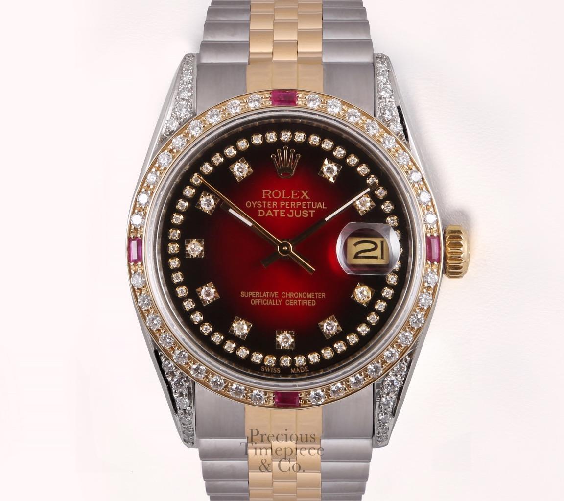 BRAND Rolex MODEL Datejust Two Tone Yellow Gold/Stainless Steel CASE Rolex Stainless Steel & Diamond Lugs-36mm BEZEL Custom 18k Yellow Gold Bezel w/ Ruby and Diamonds DIAL Custom Red Vignette Dial with Diamond String and Diamond Hour Markes BRACELET Rolex Stainless Steel & 18k Yellow Gold Jubilee Bracelet Rolex Stainless Steel Folding Clasp Size inch-Additional Links Available MOVEMENT Rolex Automatic Winding Quickset Movement CRYSTAL Rolex Scratch Resistant Sapphire Crystal BOX/PAPER Rolex Box Included-No Paper CONDITIONS Excellent Condition-Overhauled and Fully Polished WARRANTY Precious Timepiece & Co. 2 YEAR WARRANTY Rolex Datejust 2 Tone 36mm-Red Vign. String Diamond Dial-Diamond Lug/Ruby Bezel Rolex Datejust Two Tone 36mm-Red Vignette String Diamond Dial-Diamond Lug/Ruby Bezel Click images to enlarge Description This is a Pre-Owned Rolex watch. This timepiece has been fully serviced, polished, and overhauled by our professional watchmakers. The watch is guaranteed to be fully functional and accurate in timekeeping. Includes Box - Certificate from Precious Timepiece & Co. BRAND Rolex MODEL Datejust Two Tone Yellow Gold/Stainless Steel CASE Rolex Stainless Steel & Diamond Lugs-36mm BEZEL Custom 18k Yellow Gold Bezel w/ Ruby and Diamonds DIAL Custom Red Vignette Dial with Diamond String and Diamond Hour Markes BRACELET Rolex Stainless Steel & Yellow Gold Jubilee Bracelet Rolex Stainless Steel Folding Clasp Size 7.0 inch-Additional Links Available MOVEMENT Rolex Automatic Winding Quickset Movement CRYSTAL Rolex Scratch Resistant Sapphire Crystal BOX/PAPER Includes Box CONDITIONS Excellent Condition-Overhauled and Fully Polished WARRANTY Precious Timepiece & Co. 2 YEAR WARRANTY Feel free to screenshot or print this image as a wrist and watch size reference. Buy with Confidence We want you to be comfortable when buying from us, whether you're a long-time customer or considering your first purchase. We believe in our products and we stand behind them. All of our images are actual pictures of the merchandise being sold. Warranty Our company has professional watchmakers to deliver our customers the top notch services. All of items being sold are backed by 2 Year Warranty with our in-house service center. We work hard to provide our customers full satisfaction with their purchased products. To resolve any issues immediately, please contact us before making any other actions. Shipping All of our products are shipped with via USPS/Fedex/DHL. All shipments include tracking number, signature, and insurance. Signature requirement is mandatory for items above $350. Some purchases (depending on value) may be subjected to Held for Pickup at your local Fedex Facility. We will notify you prior to shipment. Some purchases (depending on value) may be subjected to Held for Pickup at your local Fedex Facility. We will notify you prior to shipment. Watch orders take 3-5 days of handling time and ship Fedex prior overnight with (Excluding weekends) International Buyers -Please contact us to determine whether we ship to your country prior to purchasing or bidding. We do not ship to P.O Box addresses! Returns If the buyer is not satisfied with our product, an exchange or refund will be available within 14 days. Seller pays the return shipping charge. Refund will be denied if (1) The watch is worn (2) Removed links (3) Negligent use of the timepiece (4) Interacting with Internal Mechanisms. Prior to making a return decision, please contact us via Ebay message, E-mail, and/or phone Return Instructions: Select “Return this item”, then select “ I don’t need it anymore” The payment will be refunded within 2-3 business days upon the receipt of the return item. Payments Payments are preferred with via Paypal. Payee’s must have a confirmed address on Paypal. Payments must be received within 3 days. If delayed, please contact us immediately. International Buyers Note: Import duties, charges, and sales tax are not included in our item price or shipping cost. These are the payee’s responsibility. Please check with your country’s custom for additional charges prior to purchasing or biddings on our items. Track Page Views With Auctiva's Counter