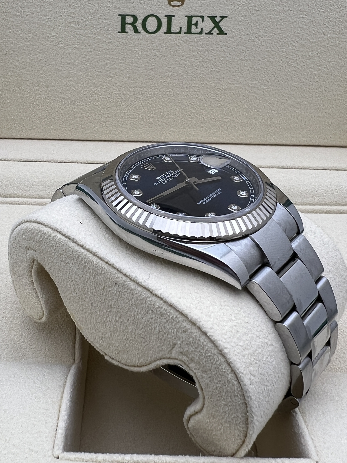Rolex Datejust 41mm reference 126334G. Stainless steel oyster bracelet and case with an 18 karat solid white gold fluted bezel. Watch has a factory original blue diamond dial. Watch comes Complete with Box, Papers, Manuals & Hangtag, factory warranty. Rolex Datejust 41 126334 Blue Diamond Dial Oyster 18K Fluted Watch Box Papers Description Rolex Datejust 41mm reference 126334G. Stainless steel oyster bracelet and case with an 18 karat solid white gold fluted bezel. Watch has a factory original blue diamond dial. Watch comes Complete with Box, Papers, Manuals & Hangtag, factory warranty. Ships from Address 608 5th Ave, STE 406 - New York NY, 10020 Phone 16466697750 Condition Pre Owned Highlights Case Size 41 mm Wrist Fit 7.5 inch Box Yes Papers Yes SKU 000269 General Info MSRP 16995 Brand Rolex Type Wristwatch Department Men Model Number 126334 Country/Region of Manufacture Switzerland Style Luxury Model Rolex Datejust 126334 Features/Other Details Year Manufactured 2021 Customized No With Original Packaging Yes With Booklet Yes With Papers Yes Manufacturer Warranty Yes SKU 000269 Features Date Indicator, Diamond Accent, Fixed Bezel, Luminous Dial, Sapphire Crystal, Screwdown Crown, Self-Winding, Swiss Made, Swiss Movement, Water-Resistant Band/Bracelet Details Band Color Steel Band Material Stainless Steel Closure Fold-Over Clasp Band Type Bracelet Band Width 15.5 mm Lug Width 20 mm Wrist Fit 7.5 inch Case Details Case Material Stainless Steel Case Color Steel Water Resistance 100 m (10 ATM) Watch Shape Round Caseback Solid Case Finish Polished Case Size 41 mm Case Thickness 12 mm Bezel Details Bezel Type Fixed, Fluted Bezel Color White Gold Display Dial Color Blue Display Analog Indices 12-Hour Dial, Diamond Markers Movement Movement Mechanical (Automatic) Number of Jewels 31 Jewels Shipping Warranty Return Policy FAQ We take all steps to make shipping as seamless and secure for both us as the seller and you as the buyer. We ship all items via Federal Express, all items require signature on delivery to confirm receipt of the package. Furthermore, most higher priced watches sold on eBay go through the authentication program where we ship the watch to eBay and they then send it along to you after passing their authentication and certification process. This ensures that you are receiving exactly what you bought as described for a worry free transaction process. Unless otherwise stated most new items carry the manufacturer warranty from the date of the original sale. This tends to be more often than not within one year of the date sold by us on eBay. If no warranty is implicitly described we warranty against any defects in mechanical workmanship for up to one year from purchase. Accidental damage, wear and tear, third-party modification or service and/or improper use are not covered and will void the warranty, repairs can still be performed at a cost. Pre-owned watches will list what manufacturer warranty, if any, applies. If not listed they will default to our 1 year from date of purchase warranty. Warranty covers labor only, parts, if any required, are subject to a charge at cost. Warranty repairs are subject to shipping charges, local drop off and pickup is available. Even outside of a warranty period we can always provide top quality service and very competitive pricing for service, repair and/or refinishing by our Watchmakers trained and specialized in Swiss Mechanical Watches. Most items have a worry free 14 day return policy. All items are photographed and described accurately and shipped in the condition described. Any signs of wear will void any return privileges, the watch must be returned in the condition received, in working order and free from signs of use and wear. The packaging process is under constant video surveillance and securely sealed in its packaging box. Should you need to return the item please reach out to us first so we may assist you in that process if there is anything that is needed as well as to guide you on the process to ship us back something securely. Q: How may we contact you? A: We are available through ebay messaging, phone or in office as well as on social media. Chrono On Fifth LLC 608 5th Ave STE 406 New York, NY 10020 tel 646 669 7750 IG: @ChronoOnFifth Q: Are all of the items listed original and authentic? A: Yes! All of our items are guaranteed authentic. Very few items may be customized (Bezels, Dials, Custom set diamonds etc) and they are clearly and accurately described as such. We only source from reputable sources in the industry and items pass through multiple layers of authentication. In the rare event some parts that are no longer produced and a repair is required these may be used but are 100% matches to OEM specificities. About Us Over 30 years in Jewelry and Watches business, located on the world renown Fifth Ave in the heart of Midtown Manhattan, Chrono On Fifth specializes in Selling and Buying luxury Swiss watch brands such as Rolex, Audemars Piguet, Patek Philippe, IWC, Hublot, Omega, Panerai, Chopard, Cartier, Bvlgari amongst many others. We are your one stop shop for Buying, Selling or Repairing your wristwatch. We source all of our watches from reputable sources worldwide to bring you the lowest prices and guaranteed authentic items. All watches are inspected upon receipt before we make them available for sale. Just a few steps away from Rockefeller Plaza and across from Saks Fifth Ave you can feel comfortable and safe shopping in our private office or through the phone or web. Please reach out anytime should you want to buy or sell or trade any timepiece as well as repair or service your watch if needed. Please schedule an appointment if you would like to come into the office in person and view an item in our private showroom. Call or message us about your trade in or any other questions you may have! Chrono On Fifth LLC 608 5th Ave STE 406 New York, NY 10020 tel 646 669 7750 IG: @ChronoOnFifth Chrono on Fifth LLC is not affilia