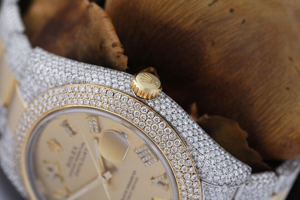 Rolex Datejust 41 mm Gold & Steel Iced Out Diamond Watch Champagne Roman Dial Brand: Rolex Series: Datejust Model: 126303 Case Diameter: 41 mm Bracelet: Oyster band; 18k yellow gold Bezel: Custom Diamond Set, 18k gold plated Dial: Custom set champagne diamond dial The sale includes a jewelry watch box and an appraisal certificate which states the watch's credentials Attached to the appraisal certificate is our 1 year mechanical warranty and lifetime diamond replacement warranty Diamonds are set aftermarket not originally by Rolex