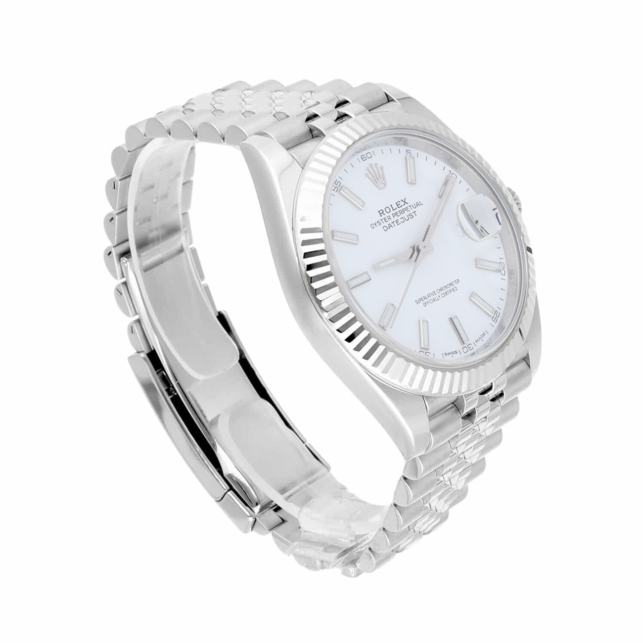 Rolex Datejust 41mm 126334 18k White Gold Fluted Bezel Stainless Steel Jubilee White Dial 2017 Rolex Datejust 41mm 126334 18k White Gold Fluted Bezel Stainless Steel Jubilee White Dial 2017 The Rolex Datejust 41 (reference 126334) is a luxury wristwatch featuring a stainless steel case, an 18K white gold fluted bezel, and a Jubilee bracelet. It has a classic white dial with hour markers and is powered by Rolex's automatic movement. With a water resistance of up to 100 meters, it combines elegance and functionality, making it suitable for various occasions. Its unisex design appeals to both men and women. This watch comes with its original box and papers. Shipping Shipping cost: Free shipping in orders above $1,000 Delivery time: 2 days Payment We accept the following payment methods: Credit & Debit Cards Bank Wire Please contact us if you have any questions. Contact Information Phone: (212)382-2600 Address: 62 West 47th Street Suite 806, New York, NY 10036