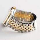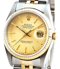 Mon-Thurs: 8:30 am – 5:30 pm (CST) Friday 8:30 am - 2:30 pm (CST) Lifetime Trade-Up Guarantee 30 Days Return Policy 1 Year Warranty Rolex Datejust Mens 18K Gold Stainless Steel Gold Watch Tapestry Dial 16233 BeckerTime is proud to offer this handsome Men's 36mm Rolex 2Tone 18K Yellow Gold & Stainless Steel Datejust Watch ref #16233 with a Gold Tapestry Dial. And it get's better...This is the desired QUICKSET MODEL with the SAPPHIRE CRYSTAL and a Rolex Jubilee band. This Rolex is in EXCELLENT CONDITION. SKU: 16233B11BCDMT 1 Year Warranty Specifications Brand Rolex Model Name Datejust Model No. 16233 Gender Men's Case Diameter 36mm Box No Papers No Condition Preowned - Excellent Condition (See Condition Grading Scale below) Warranty Yes - BeckerTime 1 Year Warranty Lifetime Trade-Up Guarantee This Rolex comes with the BeckerTime Lifetime Trade-Up Guarantee Watch Features Movement Rolex officially certified chronometer self-winding automatic movement with QUICKSET Date function Dial Rolex GOLD TAPESTRY dial with raised yellow gold stick markers Bezel Rolex solid 18k yellow gold FLUTED bezel Crystal Aftermarket Sapphire Crystal Case Rolex stainless steel case Band Rolex 2tone 18k yellow gold and stainless steel Jubilee bracelet with Rolex signed clasp. Moderate stretch/wear Max Wrist Size 7 1/2" wrist Additional Links Available for an additional cost. Link adds 1/4" AS WITH ALL OF OUR WATCHES, AUTHENTICITY IS GUARANTEED! THIS IS A FILE PHOTO. On This Item On All Items Condition Grading Scale Brand New 10 New. Perfect condition and never worn. The watch has the original manufactures protective plastic (if applicable). It may or may not come with original box or papers. It is working properly, keeping very good time. Super Excellent Condition 8.5 to 9.5 Super nice. Light signs of wear. Watches with the original band will have moderate to minimal stretch between the links. The watch is working properly, keeping good time. Never Worn 9.8 to 9.9 New. Perfect condition and never worn. The watch has the original manufactures protective plastic (if applicable). It may or may not come with original box or papers. It is working properly, keeping very good time. Excellent Condition 7.0 to 8.5 Nice. Signs of wear. Depending on the age of the timepiece, watches with the original band will have loose or moderate stretch and wear between the links. The watch is working properly, keeping good time, but may gain or lose up to 30 seconds over 24 hours. Super Mint Condition 9.7 to 9.8 Perfect. Looks never worn. As close to new as you can get for a preowned watch. This is the equivalent of a new watch that does not have the original manufactures protective plastic (if applicable). If you remove the protective plastic from a brand new watch, and have not yet worn the watch, it is now in Super Mint Condition. It may or may not come with original box or papers. It is working properly, keeping very good time. Fair Condition 5.0 to 7.0 Fair. Signs of heavy wear. Watch may have a few dings, nicks, or deep scratches The band has severe stretch between the links. The watch is working, but may gain or lose a few minutes over 24 hours. Mint Condition 9.5 to 9.7 Near perfect. Looks like new on the wrist. Signs of wear are only visible with a loupe. The band has no stretch or wear. The watch is working properly, keeping very good time. Poor Condition Less than 5 Poor. Signs of extreme heavy wear, damage, or abuse. Major cosmetic and/or mechanical flaws that directly affect the integrity of the watch. The watch may be missing parts and/or may not run at all. We do not recommend this watch to be worn in this condition. Requires a lot of work to be made wearable. Brand New 10 New. Perfect condition and never worn. The watch has the original manufactures protective plastic (if applicable). It may or may not come with original box or papers. It is working properly, keeping very good time. Never Worn 9.8 to 9.9 New. Perfect condition and never worn. The watch has the original manufactures protective plastic (if applicable). It may or may not come with original box or papers. It is working properly, keeping very good time. Super Mint Condition 9.7 to 9.8 Perfect. Looks never worn. As close to new as you can get for a preowned watch. This is the equivalent of a new watch that does not have the original manufactures protective plastic (if applicable). If you remove the protective plastic from a brand new watch, and have not yet worn the watch, it is now in Super Mint Condition. It may or may not come with original box or papers. It is working properly, keeping very good time. Mint Condition 9.5 to 9.7 Near perfect. Looks like new on the wrist. Signs of wear are only visible with a loupe. The band has no stretch or wear. The watch is working properly, keeping very good time. Super Excellent Condition 8.5 to 9.5 Super nice. Light signs of wear. Watches with the original band will have moderate to minimal stretch between the links. The watch is working properly, keeping good time. Excellent Condition 7.0 to 8.5 Nice. Signs of wear. Depending on the age of the timepiece, watches with the original band will have loose or moderate stretch and wear between the links. The watch is working properly, keeping good time, but may gain or lose up to 30 seconds over 24 hours. Fair Condition 5.0 to 7.0 Fair. Signs of heavy wear. Watch may have a few dings, nicks, or deep scratches The band has severe stretch between the links. The watch is working, but may gain or lose a few minutes over 24 hours. Poor Condition Less than 5 Poor. Signs of extreme heavy wear, damage, or abuse. Major cosmetic and/or mechanical flaws that directly affect the integrity of the watch. The watch may be missing parts and/or may not run at all. We do not recommend this watch to be worn in this condition. Requires a lot of work to be made wearable. Why Buy From BeckerTime About Us BeckerTime began in 1998 as the passion of father-son watch enthusiasts. We began selling on