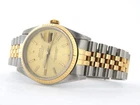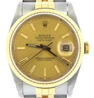 Mon-Thurs: 8:30 am – 5:30 pm (CST) Friday 8:30 am - 2:30 pm (CST) Lifetime Trade-Up Guarantee 30 Days Return Policy 1 Year Warranty Rolex Datejust Mens 18K Gold Stainless Steel Watch Champagne Dial Jubilee 16233 BeckerTime is proud to offer this nice Men's 36mm Rolex 2Tone 18K Yellow Gold & Stainless Steel Datejust Watch ref #16233 with a Gold Champagne Dial. This is the desired QUICKSET MODEL with the SAPPHIRE CRYSTAL and a Rolex Jubilee band. This timepiece is in EXCELLENT CONDITION . SKU: R952591MT 1 Year Warranty Specifications Brand Rolex Model Name Datejust Model No. 16233 Gender Men's Case Diameter 36mm Box No Papers No Condition Preowned - Excellent Condition (See Condition Grading Scale below) Warranty Yes - BeckerTime 1 Year Warranty Lifetime Trade-Up Guarantee This Rolex comes with the BeckerTime Lifetime Trade-Up Guarantee Watch Features Movement Rolex officially certified chronometer self-winding automatic movement with QUICKSET DATE function Dial Rolex GOLD CHAMPAGNE dial with raised yellow gold stick markers Bezel Rolex solid 18k yellow gold FLUTED bezel Crystal Aftermarket Sapphire Crystal Case Rolex stainless steel case Band Rolex 2tone 18k yellow gold and stainless steel Jubilee bracelet with Rolex signed clasp; Moderate stretch and wear Max Wrist Size 7 1/2" wrist Additional Links Available for an additional cost. Link adds 1/4" AS WITH ALL OF OUR WATCHES, AUTHENTICITY IS GUARANTEED! THIS IS A FILE PHOTO. On This Item On All Items Condition Grading Scale Brand New 10 New. Perfect condition and never worn. The watch has the original manufactures protective plastic (if applicable). It may or may not come with original box or papers. It is working properly, keeping very good time. Super Excellent Condition 8.5 to 9.5 Super nice. Light signs of wear. Watches with the original band will have moderate to minimal stretch between the links. The watch is working properly, keeping good time. Never Worn 9.8 to 9.9 New. Perfect condition and never worn. The watch has the original manufactures protective plastic (if applicable). It may or may not come with original box or papers. It is working properly, keeping very good time. Excellent Condition 7.0 to 8.5 Nice. Signs of wear. Depending on the age of the timepiece, watches with the original band will have loose or moderate stretch and wear between the links. The watch is working properly, keeping good time, but may gain or lose up to 30 seconds over 24 hours. Super Mint Condition 9.7 to 9.8 Perfect. Looks never worn. As close to new as you can get for a preowned watch. This is the equivalent of a new watch that does not have the original manufactures protective plastic (if applicable). If you remove the protective plastic from a brand new watch, and have not yet worn the watch, it is now in Super Mint Condition. It may or may not come with original box or papers. It is working properly, keeping very good time. Fair Condition 5.0 to 7.0 Fair. Signs of heavy wear. Watch may have a few dings, nicks, or deep scratches The band has severe stretch between the links. The watch is working, but may gain or lose a few minutes over 24 hours. Mint Condition 9.5 to 9.7 Near perfect. Looks like new on the wrist. Signs of wear are only visible with a loupe. The band has no stretch or wear. The watch is working properly, keeping very good time. Poor Condition Less than 5 Poor. Signs of extreme heavy wear, damage, or abuse. Major cosmetic and/or mechanical flaws that directly affect the integrity of the watch. The watch may be missing parts and/or may not run at all. We do not recommend this watch to be worn in this condition. Requires a lot of work to be made wearable. Brand New 10 New. Perfect condition and never worn. The watch has the original manufactures protective plastic (if applicable). It may or may not come with original box or papers. It is working properly, keeping very good time. Never Worn 9.8 to 9.9 New. Perfect condition and never worn. The watch has the original manufactures protective plastic (if applicable). It may or may not come with original box or papers. It is working properly, keeping very good time. Super Mint Condition 9.7 to 9.8 Perfect. Looks never worn. As close to new as you can get for a preowned watch. This is the equivalent of a new watch that does not have the original manufactures protective plastic (if applicable). If you remove the protective plastic from a brand new watch, and have not yet worn the watch, it is now in Super Mint Condition. It may or may not come with original box or papers. It is working properly, keeping very good time. Mint Condition 9.5 to 9.7 Near perfect. Looks like new on the wrist. Signs of wear are only visible with a loupe. The band has no stretch or wear. The watch is working properly, keeping very good time. Super Excellent Condition 8.5 to 9.5 Super nice. Light signs of wear. Watches with the original band will have moderate to minimal stretch between the links. The watch is working properly, keeping good time. Excellent Condition 7.0 to 8.5 Nice. Signs of wear. Depending on the age of the timepiece, watches with the original band will have loose or moderate stretch and wear between the links. The watch is working properly, keeping good time, but may gain or lose up to 30 seconds over 24 hours. Fair Condition 5.0 to 7.0 Fair. Signs of heavy wear. Watch may have a few dings, nicks, or deep scratches The band has severe stretch between the links. The watch is working, but may gain or lose a few minutes over 24 hours. Poor Condition Less than 5 Poor. Signs of extreme heavy wear, damage, or abuse. Major cosmetic and/or mechanical flaws that directly affect the integrity of the watch. The watch may be missing parts and/or may not run at all. We do not recommend this watch to be worn in this condition. Requires a lot of work to be made wearable. Why Buy From BeckerTime About Us BeckerTime began in 1998 as the passion of father-son watch enthusiasts. We began selling on eBay in Januar