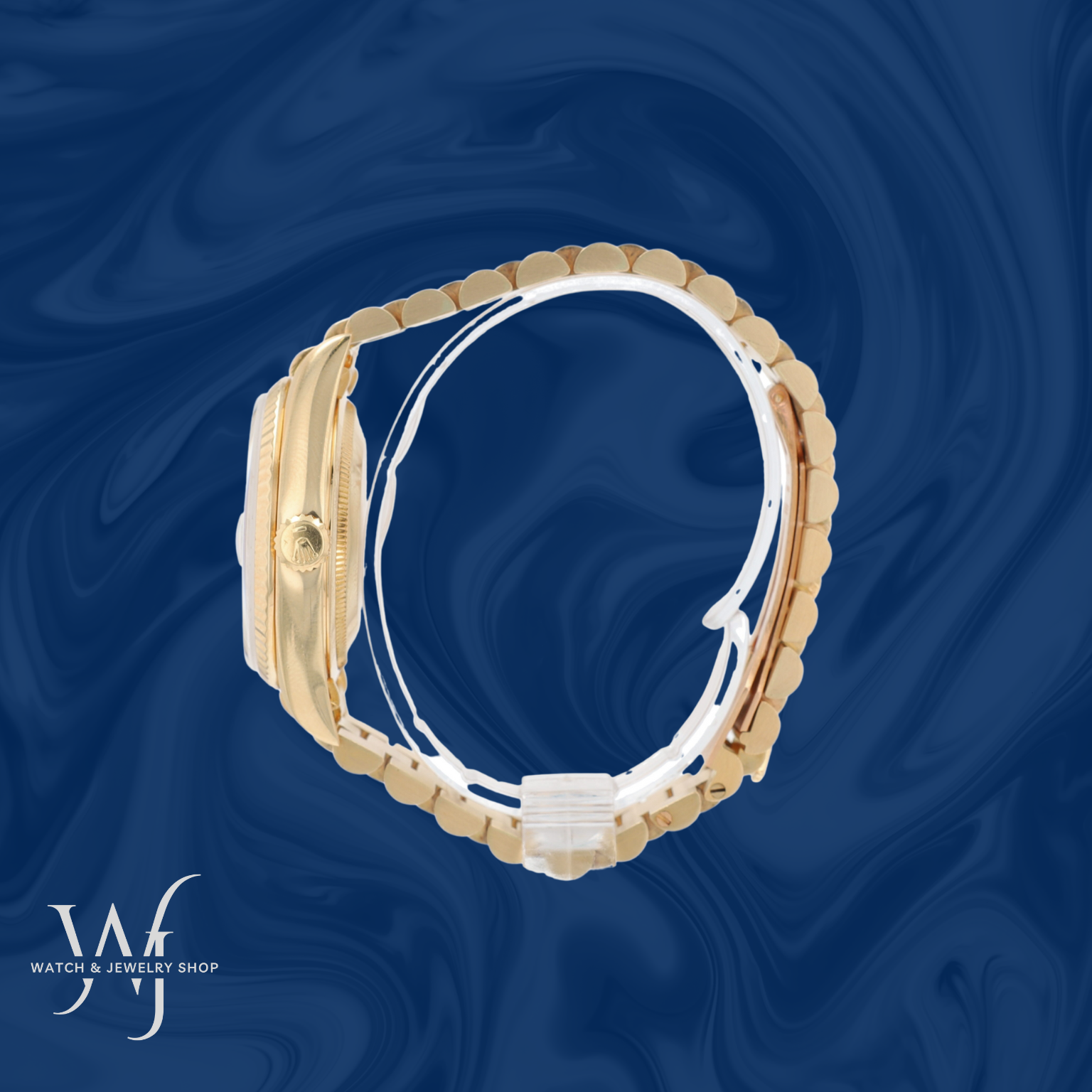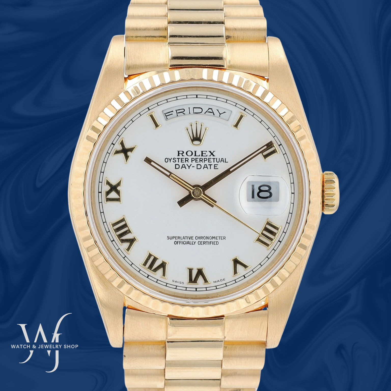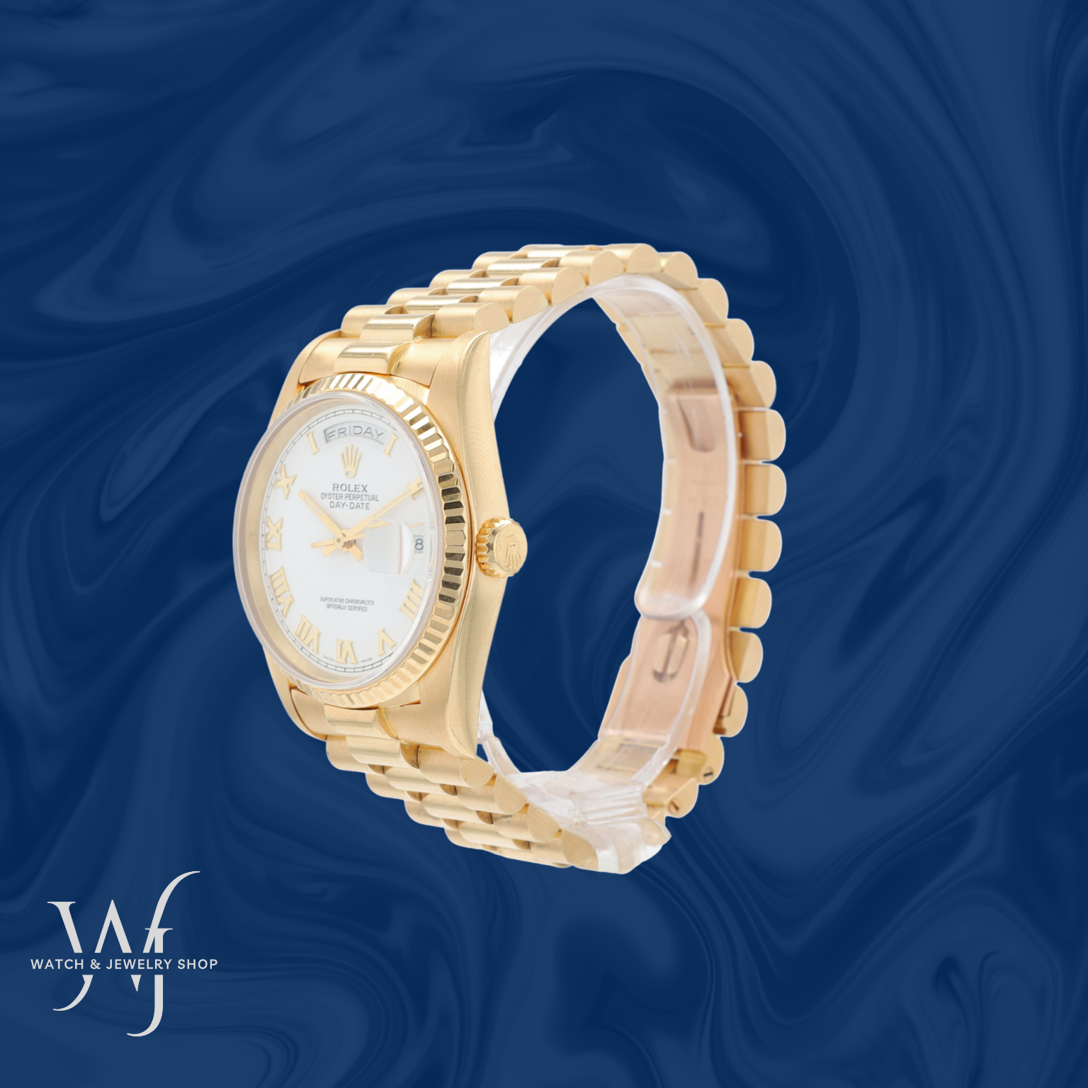 eBay Listing ROLEX MEN'S DAY-DATE 18K YELLOW GOLD ITEM SPECIFICS Brand: Rolex Model: Day-Date Reference Number: 18238 Movement: Caliber 3155 Type: Automatic Case Material: 18K Yellow Gold Case Diameter: 36mm Crystal: Sapphire Crystal Dial Color: White Dial Style: Plain Dial Hour Marker: Roman Numeral Bezel Material: 18K Yellow Gold Bezel Type: Fluted Bracelet Material: 18K Yellow Gold Bracelet Color: Yellow Gold Bracelet Type: President Band Bracelet Size: Fits wrists up to 7.5 inches Clasp Type: Concealed Crownclasp Case Back: Solid Back Case Papers: None Box: Generic Watch Box SCOPE OF DELIVERY eBay Authenticity Guarantee Certificate of Appraisal from Watch & Jewelry Shop Authenticity Card from Watch & Jewelry Shop Warranty Card from Watch & Jewelry Shop Serviced Watch to make sure it is maintaining accurate time WARRANTY Our 2-year limited warranty covers movement servicing and guarantees that the timepiece remains in optimal working condition. However, this warranty excludes the following: Wear and tear from regular use. Loss or theft of the watch. Tampering, mistreatment, or any modifications. All our watches are serviced exclusively by our certified watchmaker and undergo thorough testing for water resistance and time-keeping accuracy. This watch adheres to the highest standards of precision and quality, reflecting our commitment to offering original and non-aftermarket timepieces. SHIPPING Free Standard Shipping Within the U.S. We process orders within 2 business days unless otherwise specified. Shipping is via FedEx or UPS 2-Day service. For overnight shipping, we offer expedited options for an additional fee. Please contact us for details. RETURN POLICY We offer a 14-day return policy on most items, provided they are unused and undamaged. If the return tag or watch tag has been removed, a 10% restocking fee will be automatically applied. INTERNATIONAL SHIPPING AND REPAIRS Buyers are responsible for any applicable customs duties and taxes. If the buyer refuses to pay these fees and the watch is returned to us by the courier, the shipping cost will be deducted from the total refund amount. Our warranty covers the movement only, and the buyer is responsible for the shipping costs to and from the W&J Shop service center.