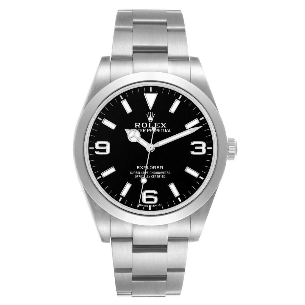 Rolex Explorer I 39mm Black Dial Steel Mens Watch 214270 Card Rolex Explorer I 39mm Black Dial Steel Mens Watch 214270 Box Card Click image to enlarge Description SwissWatchExpo 404-814-1814 Model number 214270 Stock number 68277 Year 2017 Serial number 6171xxxx Gender Mens Movement Officially certified chronometer automatic self-winding movement. Jewels 31 Caliber 3132 Case Stainless steel oyster case 39.0 mm in diameter. Rolex logo on the crown. Crystal Scratch resistant sapphire crystal. Dial Black dial with luminescent baton hour markers and Mercedes hands. Raised luminescent Arabic numerals at 3, 6, and 9 o'clock. Luminescent lollipop-tipped centre seconds hand. Bezel Stainless steel smooth bezel. Bracelet Stainless steel oyster bracelet with a flip-lock clasp and easylink micro-adjustment. Fits up to a 7 3/4" wrist. Condition Excellent condition. A few small nicks on the crystal. Engravings None Box & papers Rolex box and card. Exclusive SwissWatchExpo Certificate of Authenticity. Authenticity Certified authentic. Our elite in-house team of Swiss-trained master watchmakers inspect and certify the authenticity and the condition of the watch. Working condition Timed to precision on Witschi watch expert timing machine. Running strong and keeping the accurate time. Warranty This watch is covered by Swiss Watch Expo's 18-month warranty on anything but abuse. Pictures All the photos are of the actual watch for sale. Payment - We ONLY accept payments in United States Dollars (USD). - Payments must be made within 5 days of winning the auction. Shipping Shipping Methods All shipments are sent fully insured, using the following carrier methods: * Domestic - UPS. * International - No international shipping available Terms of Sale 18 month Limited Warranty Swiss Watch Expo is honored to have the opportunity to serve you. That's why we stand by all of our products with a full 18 month limited warranty. If an item we sell you should fail as a result of a manufacturer's defect at any time during the first year and a half , we will repair or replace the item at absolutely no cost to you. Not covered by warranty: - Regular wear-and-tear from normal use. - External damage to the product. Any damages resulting from wear to the watch case, crystal/glass, watch bracelet, watch bezel, straps, screws, crown/stem, finishes, clasps/buckles, or any other physical damage to the watch. - defects caused by outside force or improper use. Consequential and incidental damages. - the loss of precious, semi-precious stones from settings. - Outside modifications and third party repair attempts of any kind will void the warranty. - Any damage if used under conditions which exceed the watch manufacturer?s water resistance guidelines. - Watches that are labeled as water resistant feature a screw down crown. The crown must be screwed down properly at all times to keep the watch casing watertight. Water damage is not covered under the warranty unless it is proven defective by the SwissWatchExpo Repair and service Center. Our 100% Money-Back Guarantee At Swiss Watch Expo, we understand that your purchase is a significant investment - one that you will pass down to future generations. That's why we're happy to give you a no-questions-asked money-back guarantee with no restocking fees. If you're not satisfied with your purchase, just let us know within 7 days after the purchase and we'll honor your return and issue a full refund, no questions asked. *Deductible amount for domestic shipping costs: $50 About Us This fine piece is a part of collection offered by Swiss Watch Expo , members of the National Association of Watch and Clock Collectors (NAWCC) and the International Watch and Jewelry Guild (IWJG). We are third generation jewelers who have been selling fine Swiss timepieces and elegant jewelry since 1982. We've built our reputation on quality, service and integrity, and we treat each customer with the utmost respect. We stand by all of our products with a generous warranty and guarantee, so you always know that when you bid with Swiss Watch Expo , you can can bid with confidence! About Swiss Watch Expo Thank you for the opportunity to serve you and welcome the Swiss Watch Expo ebay auction, where we proudly offer our collection of top quality Swiss timepieces and fine jewelry. We are third generation European trained master watchmakers and jewelry makers dealing in Fine Swiss watches, elegant gemstones and precious jewelry for nearly 30 years. Why You Should Choose Swiss Watch Expo Unlike many online resellers, at Swiss Watch Expo , we have built our business the old fashioned way - through our brick and mortar store in Atlanta, Georgia, providing our customers the very best products at an incredible value, while giving them the exemplary service they deserve. Now, as we serve the Ebay community, our commitment to the same philosophies holds true. We invite you to browse through our customer feedback to read about the experience others have had with us through Ebay. What Makes Swiss Watch Expo Products Better Than The Competition Every watch we sell has been completely inspected to ensure years of optimal functionality. What's more, there are never any middlemen involved in the process. From the time we purchase a watch, our experianced master watchmakers handle all repairs and restoration, making the watch as good as new. We've invested thousands into our state-of-the-art repair facility in order to carry out our commitment to quality. As for jewelry, every item is of the highest quality, using only the finest precious metals and gemstones available. When You Choose Swiss Watch Expo , You Have Nothing To Lose When you purchase an item from Swiss Watch Expo on Ebay, you have complete peace of mind. That's because we offer you a generous money-back guarantee without any restocking fee, no questions asked. Our philosophy is simple: By being committed to quality, service and value, we have satisfied customers who come bac