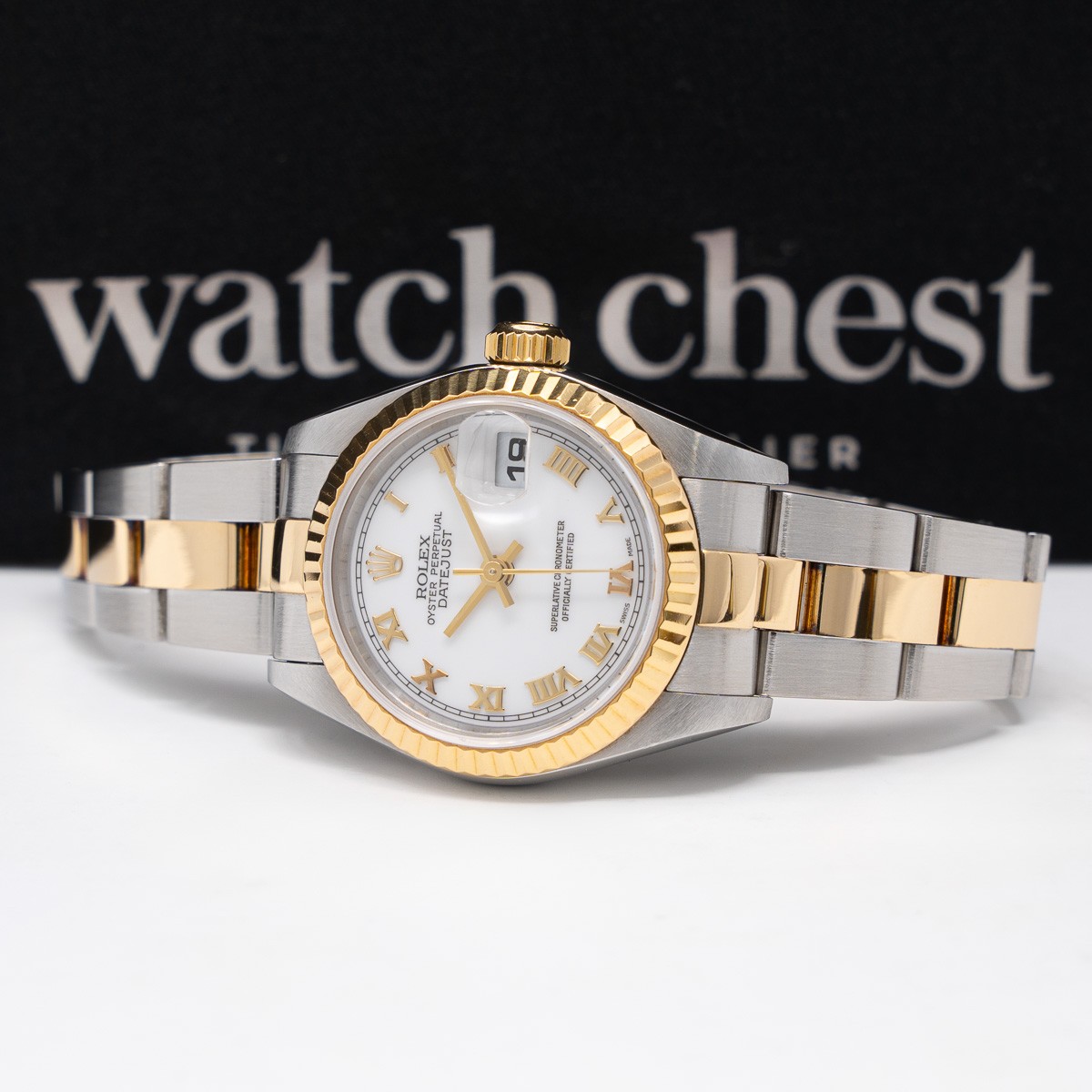 HOME ABOUT US CUSTOMER FEEDBACK CONTACT US Visit the watch chest ebay store to view all items Rolex Lady-Datejust, White Roman Dial, Steel & Gold, 69173 Rolex Lady-Datejust, White Roman Dial, Steel & Gold, 69173 Item Description SKU 10003 Year: ~1995 Condition: Excellent - Shows no to minimal signs of use. Perfect for gifting. The case and bracelet have been expertly and lightly refinished, presenting a pristine appearance with no discernible imperfections. The movement has been professionally cleaned and tested, ensuring it keeps excellent time. Comes With: Watch Chest Certificate of Authenticity,Watch Chest Appraisal, Watch Chest 2-Year Warranty Unlock endless possibilities with a hand preserved Rolex from Watch Chest Timepiece Atelier. Hours of highly skilled work has been poured into this timepiece by a Rolex trained master watchmaker to ensure top performance and integrity. Photography props used in lifestyle photos not included. About Us About Us Payment Shipping Returns Warranty About Us Founded in 2002 by Chris Wiley, Watch Chest has the distinction of being one of the world's first online-exclusive watch atelier. As a small family-owned and operated business, our mission is to personally help you build a watch collection you love. We are guided by core values: Exceptional Client Experiences: Providing personal service for every client. Authenticity & Transparency: Ensuring every timepiece meets strict authenticity standards and every transaction is transparent. Traidition & Craftsmanship: Practicing the timeless art of watchmaking with excellence. Sustainability & Preservation: Sustainably extending the lifespan of watches while preserving their unique history. Payment Payment Watch Chest strives to offer flexibility to our customers via a wide array of payment options. Accepted Payment Methods Include: Credit Card - All major credit cards accepted Trades - Please contact or call to discuss trades Shipping Shipping Orders usually ship ~2-3 working days after the order is placed. If an item goes through the eBay authentication process: After the purchase of an Authenticity Guarantee Eligible Item on eBay, we will ship (expedited and insured) the item to an eBay Authentication Facility for them to carefully inspect the item's authenticity and confirm the item?s listing details. Once the item's authenticity is confirmed by the Authentication Facility, the item is securely shipped to the buyer via signature required 2 day shipping. If the item?s authenticity cannot be verified or the item is not as described, the item is returned to the seller and a refund is issued. If an item does not go through eBay authentication process: With years of experience, Watch Chest provides the safest, most reliable way to ship a high-value item. Extra care is taken as we box your watch in inconspicuous multi-layer packaging and ship overnight to minimize the amount of time between leaving our hands to when it arrives at your door ? fully-insured every step of the way. We believe this attention to detail should be expected. And that it should be free. Returns Returns Watch Chest provides a refund guarantee for any reason within the first 14 days of delivery with the security tag still attached to the article being returned. A return shipping fee applies to all returns. The article must be returned in the same condition received, with all accessories accompanying the article. This can include books, box, etc. All accessories with the article must be returned intact and undamaged. New/Never-worn watches must also be returned with all original factory seals, tags, etc. intact. An 18% restocking fee may also apply to new/never-worn watches. All return fees will be deducted from the refund. Any of these actions not performed by Watch Chest will void a return and/or refund: Removal of security tag Missing accessories Modifications Alterations Damage Sizing "Wear and Tear" If Watch Chest accepts a voided return, any costs associated with the return will be deducted from the refund. This includes shipping costs, repairs, service, and replacement of parts associated with the article's return. Warranty Warranty Please see our store page for full detail of our warranty policies here . Authenticity & Guarantees Certified Authentic We ensure every timepieces meets strict authenticity standards. We do not support the sale of aftermarket watches. Money-Back Guarantee Buy it, try it, and if you don't love it, return the watch within fourteen (14) days for a different watch or refund. Buyer pays return shipping. We Only Sell the Best We hand-select only the top watches, each of which passes a strict multi-point inspection. We only sell what we'd buy and wear ourselves. Your Personal Watch Dealer With over 22 years in business, owner Chris Wiley is here to help you build a watch collection you love. Shop Rolex Models Air-King Datejust Day-Date Daytona Deepsea Explorer GMT-Master II Lady-Datejust Milgauss Oyster Perpetual Pearlmaster Sea-Dweller Sky-Dweller Submariner Yacht-Master FIND A WATCH Not in stock, no problem. We'll find the watch of your dreams. REQUEST NOW SERVICE YOUR WATCH Get your watch serviced by our master watchmakers. SERVICE NOW Let's Stay in Touch! Add us to your eBay saved sellers for news, updates and promotions. STORE HOME CONTACT US Home About Us Customer Feedback Contact Us