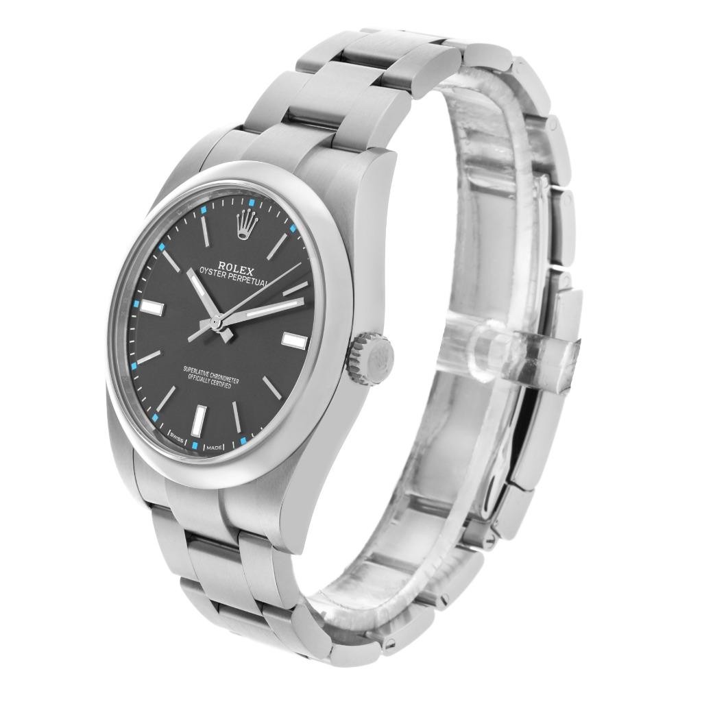 Rolex Oyster Perpetual 39 Rhodium Dial Steel Mens Watch 114300 Rolex Oyster Perpetual 39 Rhodium Dial Steel Mens Watch 114300 Click image to enlarge Description Swiss Watch Expo (404) 814-1814 Model number 114300 Stock number 70812 Year Serial number 7QY8xxxx Gender Mens Movement Officially certified chronometer automatic self-winding movement. Jewels 31 Caliber 3132 Case Stainless steel oyster case 39.0 mm in diameter. Rolex logo on the crown. Crystal Scratch resistant sapphire crystal. Dial Dark rhodium dial with luminescent baton hands and blue-accented hour markers. Bezel Stainless steel smooth domed bezel. Bracelet Stainless steel oyster bracelet with an Oysterlock clasp. Fits up to a 7 1/4" wrist. Condition Mint condition. Engravings None Box & papers Rolex box. Exclusive SwissWatchExpo Certificate of Authenticity. Authenticity Certified authentic. Our elite in-house team of Swiss-trained master watchmakers inspect and certify the authenticity and the condition of the watch. Working condition Timed to precision on Witschi watch expert timing machine. Running strong and keeping the accurate time. Warranty The watch is covered by Swiss Watch Expo's 18-month warranty on anything but abuse. Pictures All the photos are of the actual watch for sale. Payment - We ONLY accept payments in United States Dollars (USD). - Payments must be made within 5 days of winning the auction. Shipping Shipping Methods All shipments are sent fully insured, using the following carrier methods: * Domestic - UPS. * International - No international shipping available Terms of Sale 18 month Limited Warranty Swiss Watch Expo is honored to have the opportunity to serve you. That's why we stand by all of our products with a full 18 month limited warranty. If an item we sell you should fail as a result of a manufacturer's defect at any time during the first year and a half , we will repair or replace the item at absolutely no cost to you. Not covered by warranty: - Regular wear-and-tear from normal use. - External damage to the product. Any damages resulting from wear to the watch case, crystal/glass, watch bracelet, watch bezel, straps, screws, crown/stem, finishes, clasps/buckles, or any other physical damage to the watch. - defects caused by outside force or improper use. Consequential and incidental damages. - the loss of precious, semi-precious stones from settings. - Outside modifications and third party repair attempts of any kind will void the warranty. - Any damage if used under conditions which exceed the watch manufacturer?s water resistance guidelines. - Watches that are labeled as water resistant feature a screw down crown. The crown must be screwed down properly at all times to keep the watch casing watertight. Water damage is not covered under the warranty unless it is proven defective by the SwissWatchExpo Repair and service Center. Our 100% Money-Back Guarantee At Swiss Watch Expo, we understand that your purchase is a significant investment - one that you will pass down to future generations. That's why we're happy to give you a no-questions-asked money-back guarantee with no restocking fees. If you're not satisfied with your purchase, just let us know within 7 days after the purchase and we'll honor your return and issue a full refund, no questions asked. *Deductible amount for domestic shipping costs: $50 About Us This fine piece is a part of collection offered by Swiss Watch Expo , members of the National Association of Watch and Clock Collectors (NAWCC) and the International Watch and Jewelry Guild (IWJG). We are third generation jewelers who have been selling fine Swiss timepieces and elegant jewelry since 1982. We've built our reputation on quality, service and integrity, and we treat each customer with the utmost respect. We stand by all of our products with a generous warranty and guarantee, so you always know that when you bid with Swiss Watch Expo , you can can bid with confidence! About Swiss Watch Expo Thank you for the opportunity to serve you and welcome the Swiss Watch Expo ebay auction, where we proudly offer our collection of top quality Swiss timepieces and fine jewelry. We are third generation European trained master watchmakers and jewelry makers dealing in Fine Swiss watches, elegant gemstones and precious jewelry for nearly 30 years. Why You Should Choose Swiss Watch Expo Unlike many online resellers, at Swiss Watch Expo , we have built our business the old fashioned way - through our brick and mortar store in Atlanta, Georgia, providing our customers the very best products at an incredible value, while giving them the exemplary service they deserve. Now, as we serve the Ebay community, our commitment to the same philosophies holds true. We invite you to browse through our customer feedback to read about the experience others have had with us through Ebay. What Makes Swiss Watch Expo Products Better Than The Competition Every watch we sell has been completely inspected to ensure years of optimal functionality. What's more, there are never any middlemen involved in the process. From the time we purchase a watch, our experianced master watchmakers handle all repairs and restoration, making the watch as good as new. We've invested thousands into our state-of-the-art repair facility in order to carry out our commitment to quality. As for jewelry, every item is of the highest quality, using only the finest precious metals and gemstones available. When You Choose Swiss Watch Expo , You Have Nothing To Lose When you purchase an item from Swiss Watch Expo on Ebay, you have complete peace of mind. That's because we offer you a generous money-back guarantee without any restocking fee, no questions asked. Our philosophy is simple: By being committed to quality, service and value, we have satisfied customers who come back to us time and time again. Our entire staff is committed to providing you unparalleled quality and incomparable service. We hope that we have the opportunity to provide