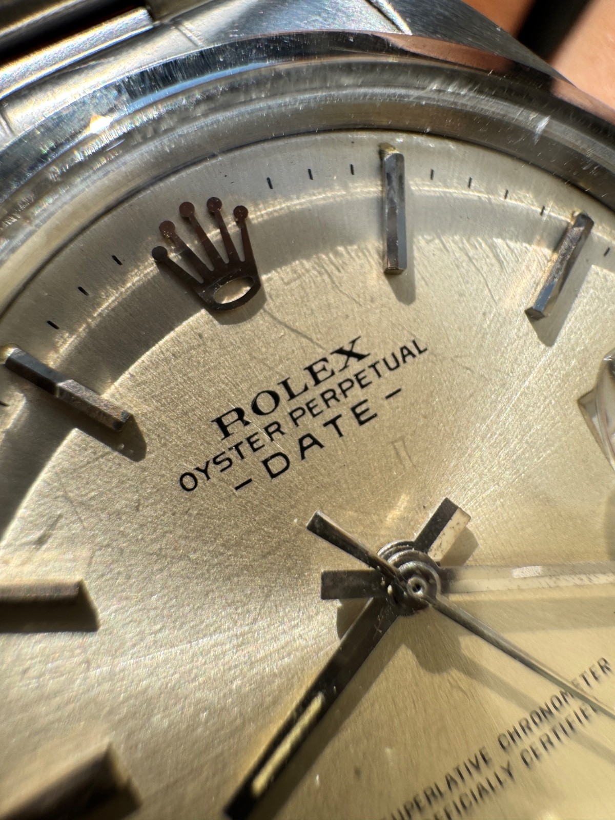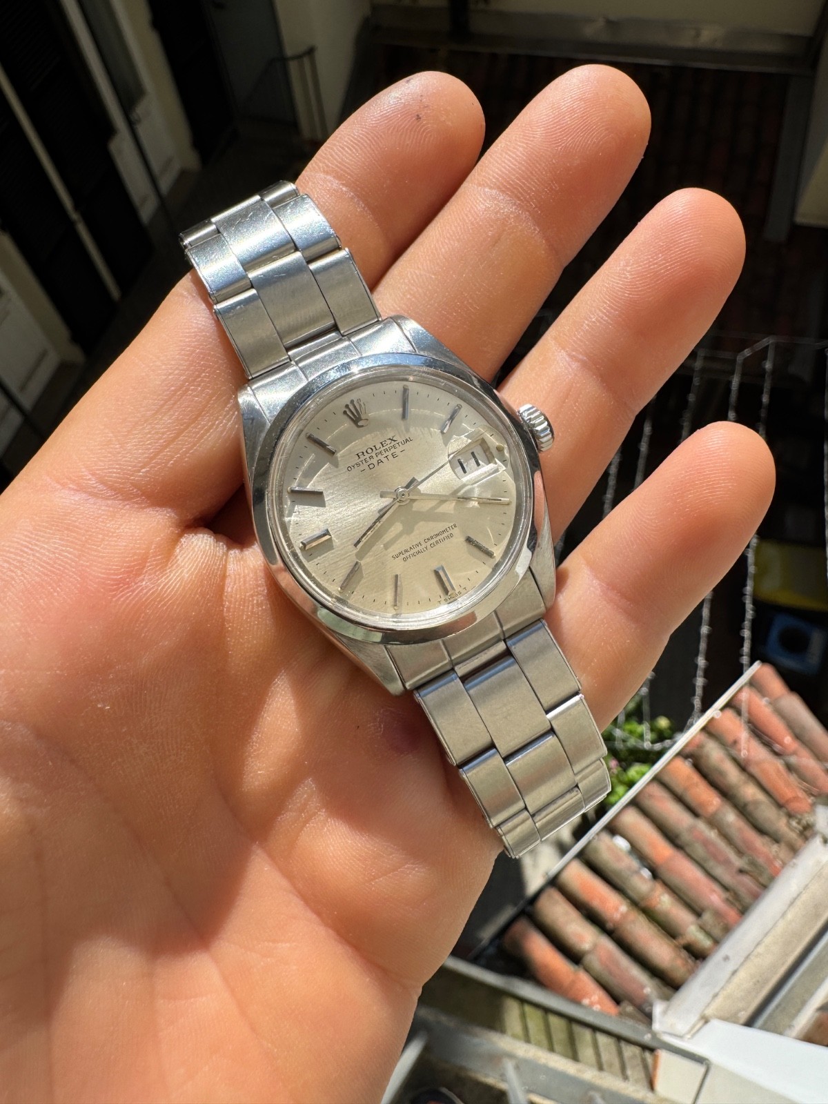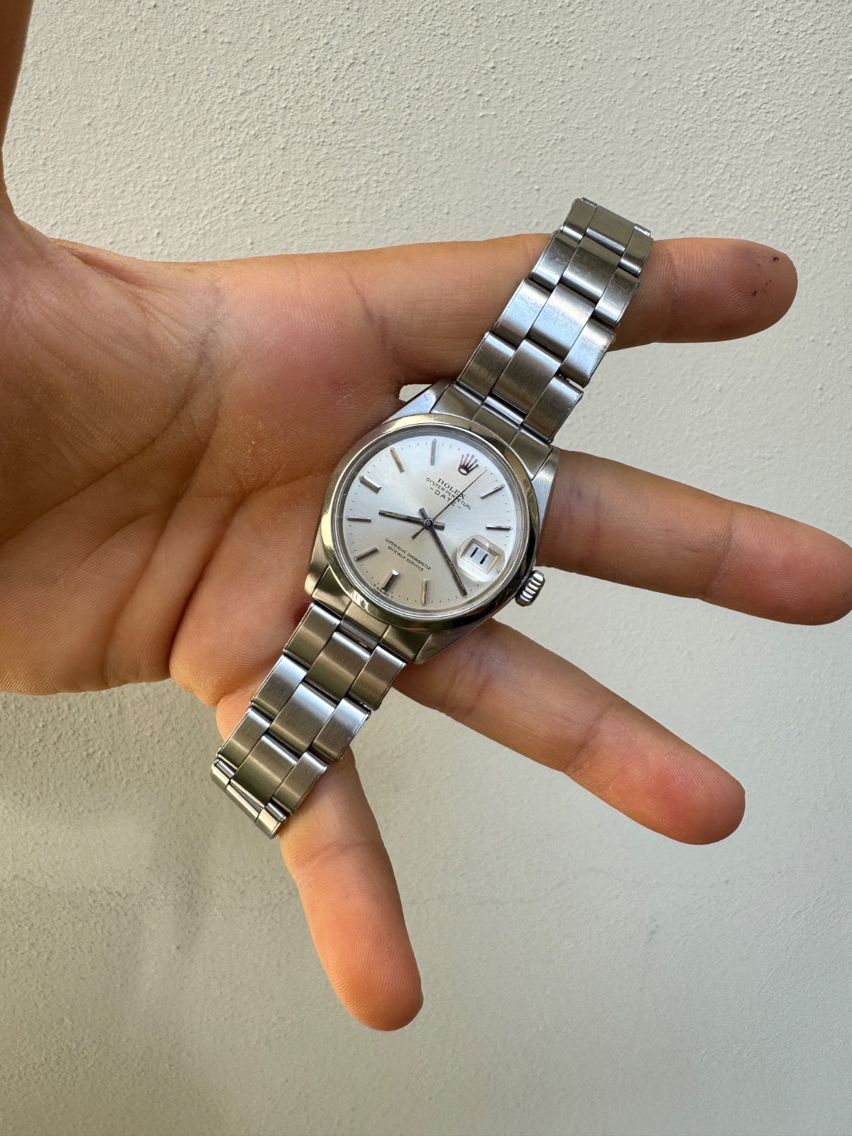 PROPONIAMO; -Marca: ROLEX DATE -Cassa: ACCIAIO DA34MM ESCLUSA CORONA , FONDELLO A VITE ORIGINALE -Movimento :ORIGINALE ROLEX CALIBRO 1570 , COEVO -Vetro:PLEXY -Corona:ORIGINALE ROLEX A VITE -Ghiera:LISCIA -Tasti: NO -Quadrante:BIANCO ORIGINALE TRIZIO , INDICI APPLICATI -Lancette: ORIGINALI TRIZIO -Cinturino/Bracciale: BRACCIALE RIVETTI RIPIEGATO ORIGINALE , FINALI 60 BRACCIALE 7205 ADATTO PER POLSI FINO A 18,5/19 CM -Scatola e documenti: NOSTRA POCHETTE IN VELLUTO COMPRESA -Condizioni : OTTIME -Revisionato:SI -Uomo/donna/unisex:UOMO/UNISEX PER QUALSIASI DUBBIO CONTATTATEMI ,RISPONDEREMO IL PRIMA POSSIBILE