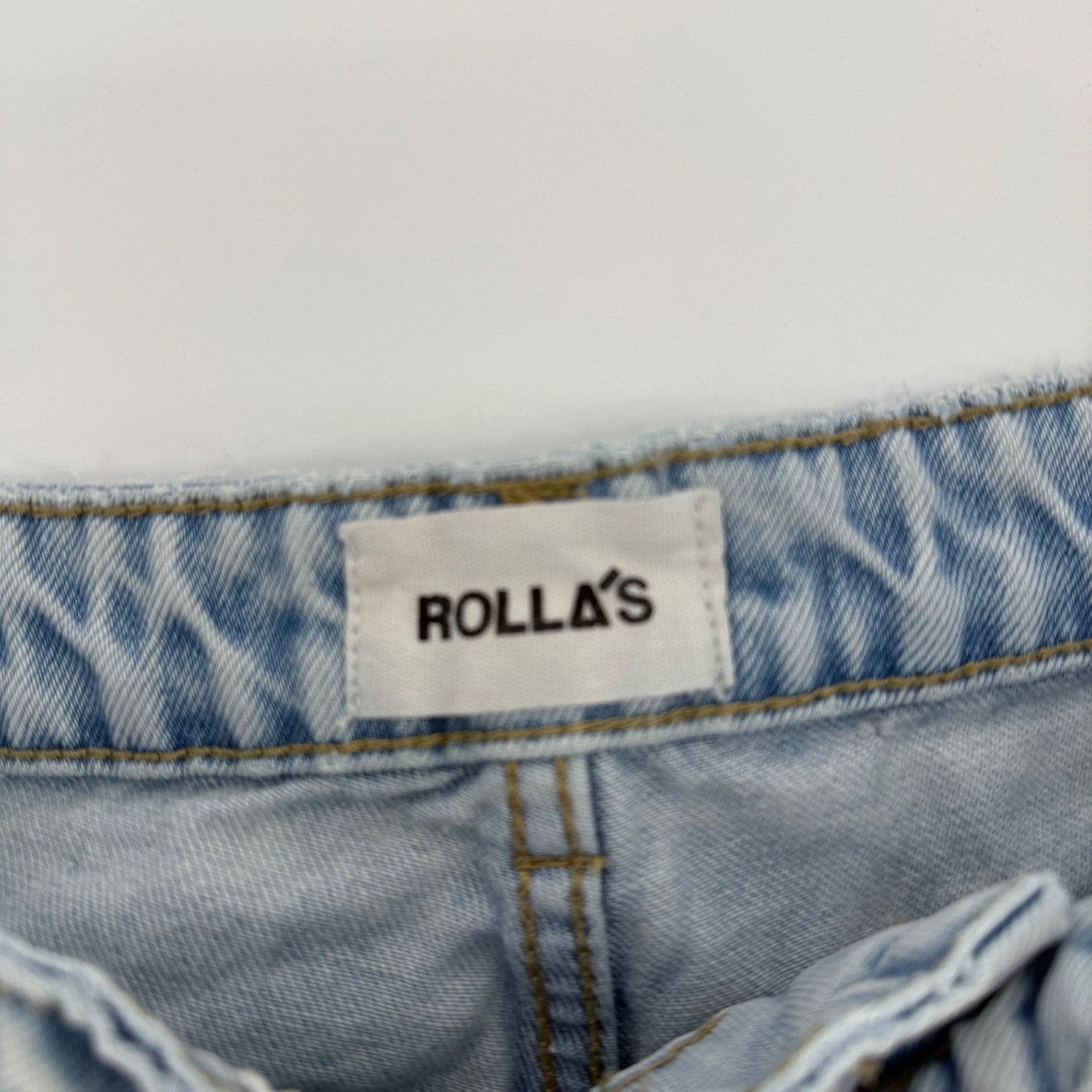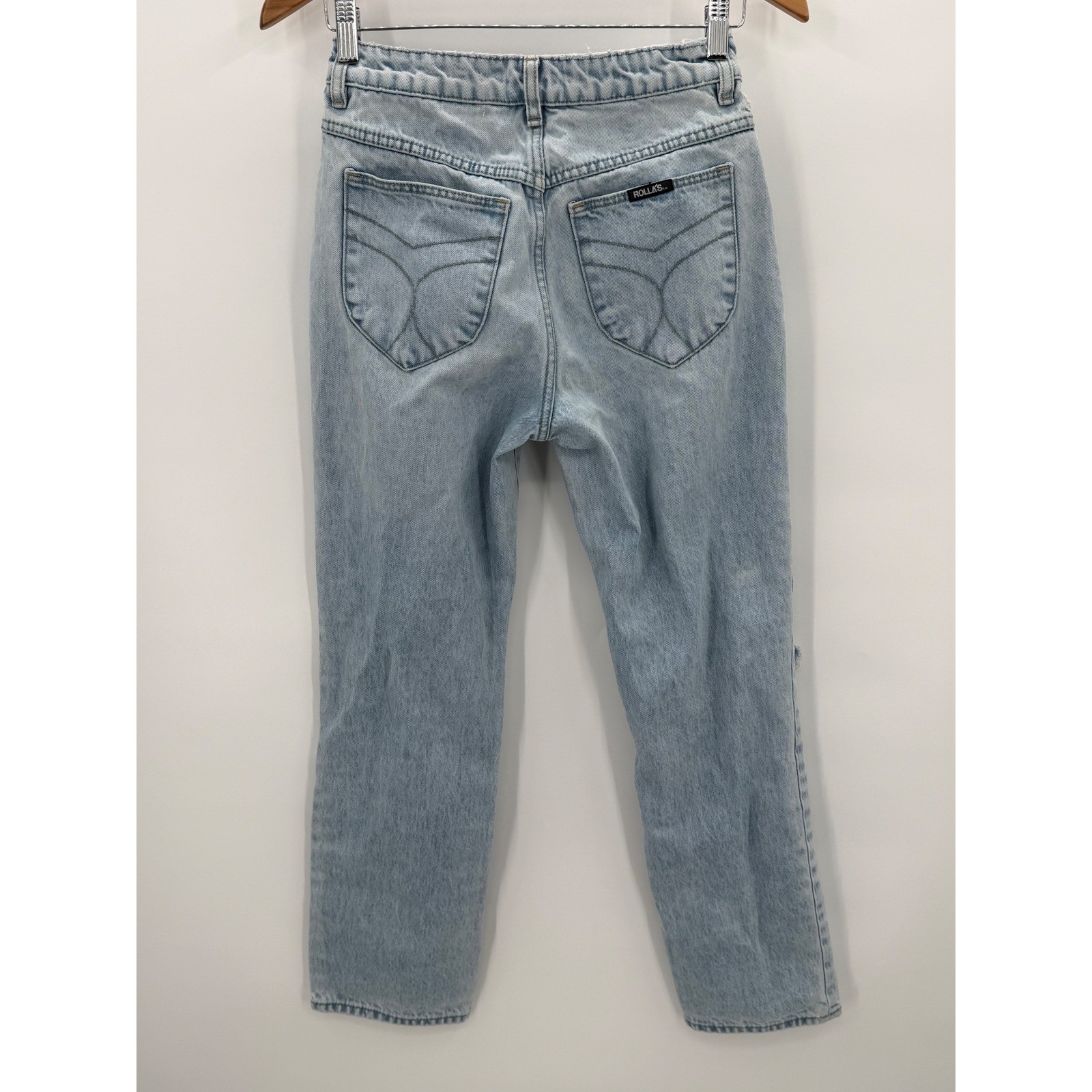 Pants have a small wear spot on back as pictured. High rise straight leg jeans crafted from 100% cotton denim in a light wash. These original fit jeans feature a classic five-pocket design with signature decorative stitching on the back pockets and a branded label. The front is detailed with heavy distressing at the knees for a lived-in, vintage-inspired look. A small, faint spot is present on the back leg as shown in photos. Measurements: • Waist: 26" • Rise: 10.5" • Inseam: 28" Brand: Rollas Material: 100% Cotton Style: High Rise Straight Color: Light Blue Closure: Zip Fly with Button Pockets: 5-Pocket Features: Distressed Knees, Signature Back Pocket Stitching Fit: Straight Leg Keywords: Rollas, Distressed Jeans, High Waisted, Straight Leg, Light Wash, 90s Style, Grunge, Streetwear, Rigid Denim, Sustainable Fashion, Aussie Brand, Casual Wear, Ripped Knees