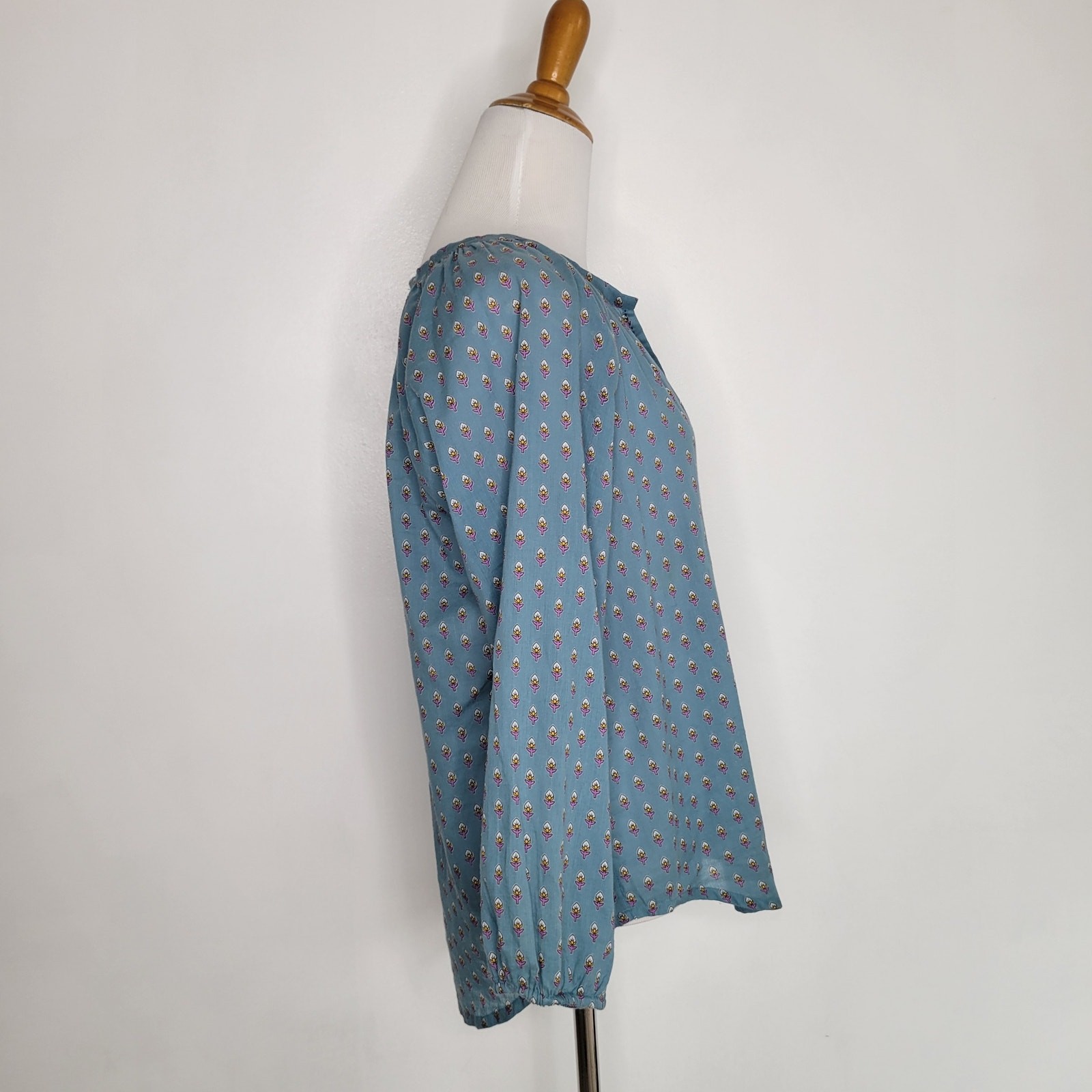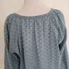 Roller Rabbit Lucy blouse Size medium 100% cotton Hand wash Pullover styling Split v neck 3/4 raglan sleeves with elasticized cuffs Lightweight Dusty blue with ditsy purple floral print Boxy, relaxed fit Approx. lay-flat measurements: Length: ~24.5" Pit to pit: ~22" Good pre-owned condition. Photo shows the elastic on one sleeve opening is undone. No other notable flaws/signs of wear