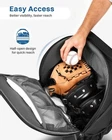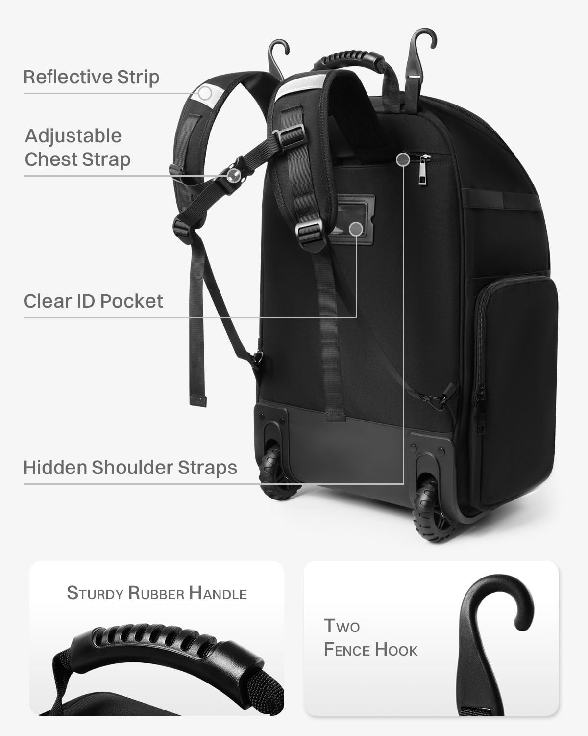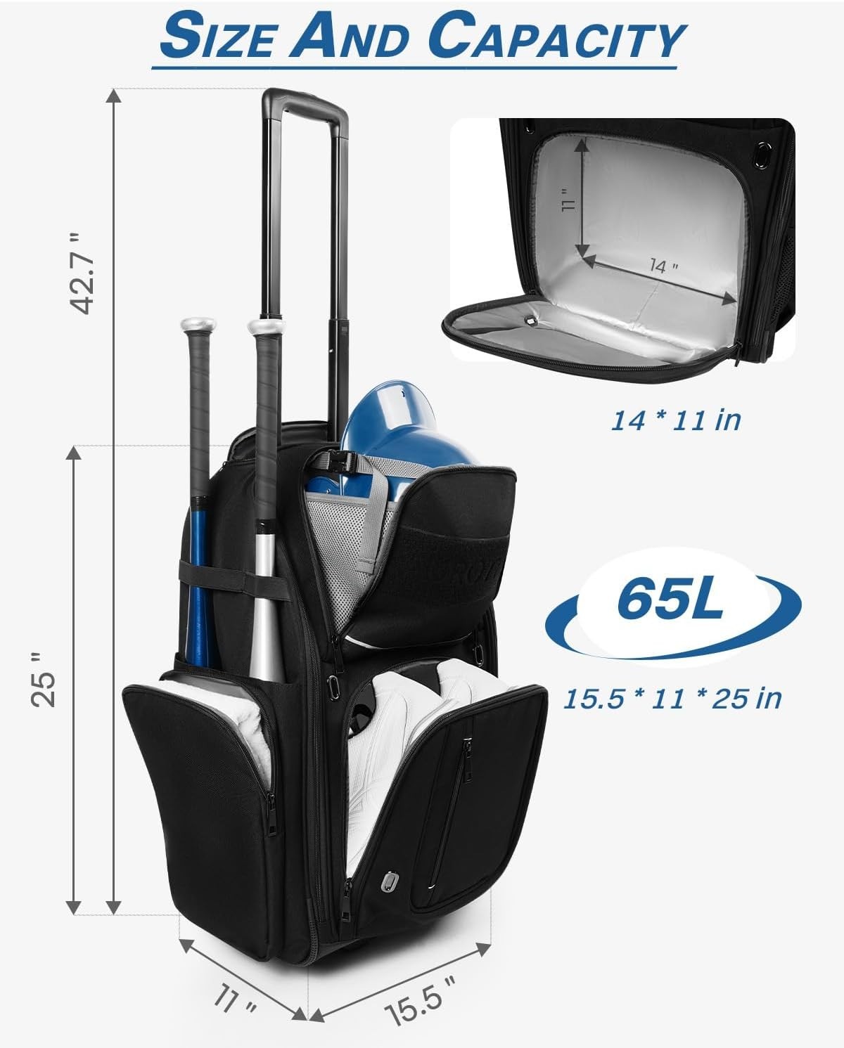 Fast Friday Store ✿✿✿✿✿ Rolling Baseball Bag w/ Wheels All-Terrain 4 Bats, Shoe Compartment & Hooks ☛ EXTRA-LARGE 65L CAPACITY FOR FULL GEAR STORAGE: Designed to hold all your essential gear, this rolling baseball bag offers a spacious 65L capacity (15.5"x 11"x 25"). The main compartment easily fits all catcher's gear and protective equipment, with built-in ventilation holes to keep everything fresh and dry after long practices or games. The wide top-opening design makes packing and access quick and effortless ☛ DEDICATED HELMET & SHOE COMPARTMENTS WITH VENTILATION: Keep your gear separated and organized in this baseball bag with wheels — the helmet compartment features an elastic mesh pocket and adjustable buckle straps to secure your helmet, while the fully independent shoe compartment allows shoes to stand upright, saving space in the main compartment. Both compartments include ventilation holes for better airflow and odor control ☛ SMART STORAGE FOR EVERYTHING YOU NEED: Stay organized in this rolling softball bag with 4 bat sleeves, a front pocket for keys or phone, and a side waterproof pocket for wet towels or drinks. The front hook-and-loop logo area lets you attach your team patch or name tag, while the back name card holder helps you easily identify your bag. Dual fence hooks make it simple to hang your bag during games or practice ☛ TOUGH, WATER-RESISTANT BUILD FOR GAME-DAY DURABILITY: Made with water-resistant 900D materials and a reinforced waterproof base, this softball bag with wheels stands upright thanks to its stable feet. The reinforced PVC back panel adds extra support and structure to this baseball roller bag. Anti-impact bars protect against wear and tear, while the overall design resists scratches, dirt, and rough handling — keeping your bag sturdy and reliable for every practice and game ☛ EASY MOBILITY WITH WHEELS, HANDLE & BACKPACK STRAPS: Roll smoothly on heavy-duty all-terrain wheels with the adjustable aluminum handle, which extends in two stages up to 17.7 inches, giving the bag a total height of 42.7 inches. Or carry it like a backpack with hidden padded shoulder straps in this wheeled baseball bag. Reflective strips improve visibility at night, while the adjustable chest buckle ensures comfort and balance. Perfect for players and coaches on the go