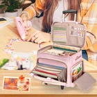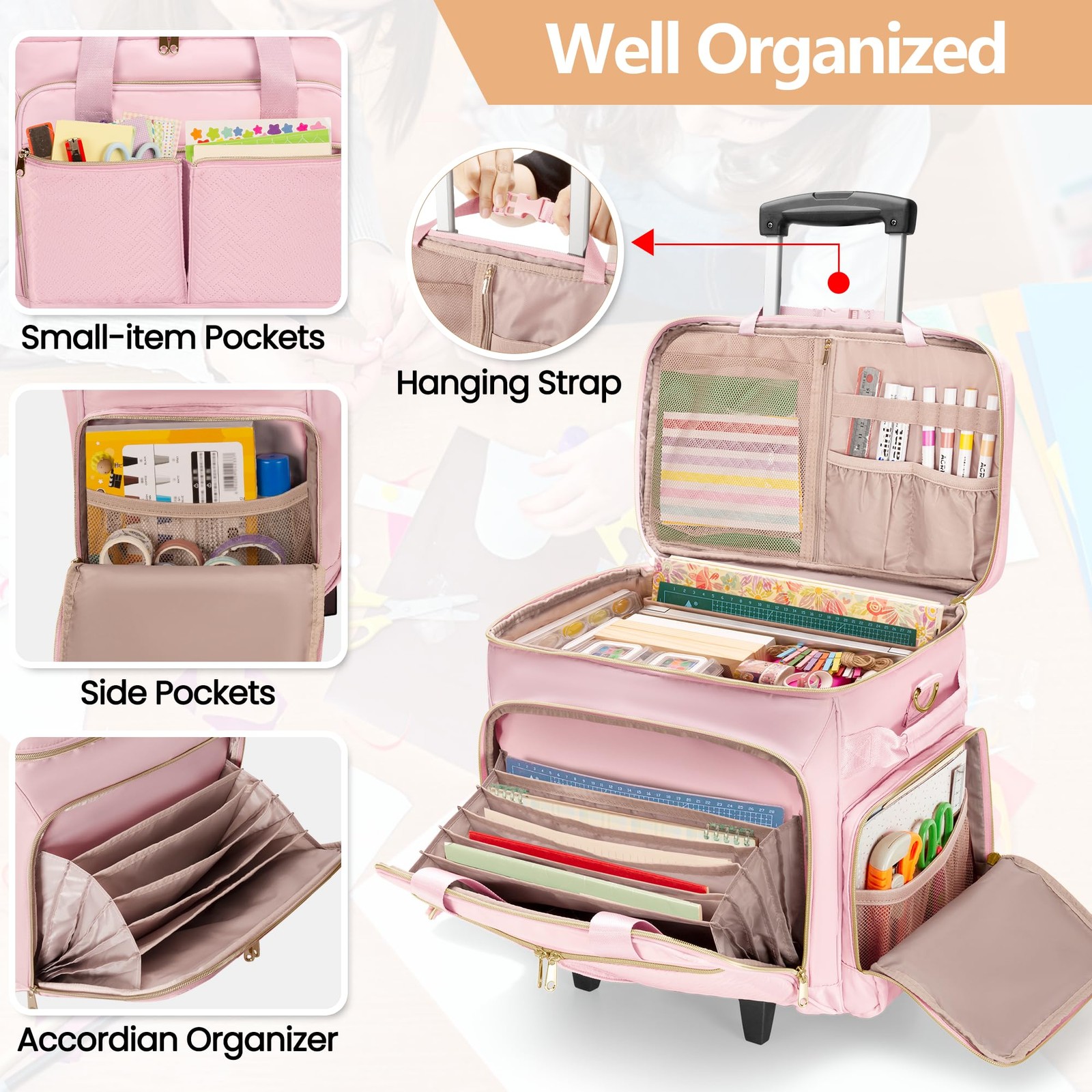 AMPLE SPACE AND ORGANIZED: This scrapbook tote bag measures 16.3”L x 8.7”W x 12.4”H. In the main compartment, the larger padded sleeve is roomy enough for a 15.6” laptop and protects your scrapbooks from crushing. The smaller sleeve is suitable for scrapbook papers and cards. 4 mesh pockets with elastic tops keep loose craft supplies organized. KEEP SHAPE AT ALL TIMES: This rolling craft bag has 2 built-in boards and 1 removable bottom board, to support the structure and prevent collapsing when filled with craft materials. Three layers of nylon fabric and foam padding protect your art supplies from all dimensions. MOBILE CRAFT TOOL HOLDER: The craft trolley case’s lid features a mesh zipper pocket and 6 elastic band tool slots, suitable for crafting tools like glue, scissors, craft knives and rulers. Top buckle strap can secure the lid to the trolley handle, keeping it open so your tools are always within reach. EXTERNAL SECTIONS: The front 2 layers includes expanding organizer with 6 individual pouches and 2 zipper pockets for conveniently sorting your stickers and papers by style. 2 side pockets with mesh pouches store small craft supplies like paintbrush sets or pipe cleaners, providing partitioned storage for easy searching. CRAFT CART FOR TRAVEL: Multiple carrying options meet the needs of different occasions. It can be used as a tote bag with 3 wrapped handles, a sling bag with a detachable shoulder strap, or a travel suitcase with trolley. The foldable trolley is easy to install and store, two-step handle extends up to 36.6 inches. Ideal new bag for craft lovers and scrapbook artists.