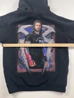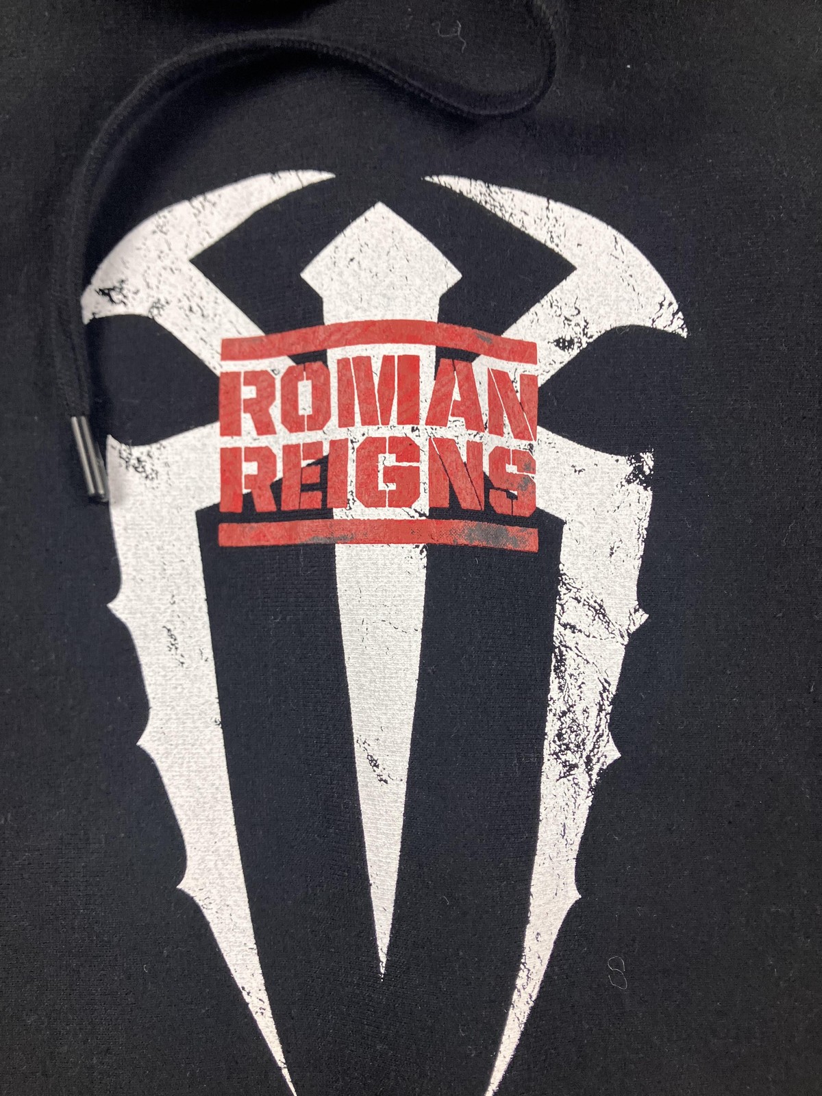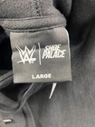 Subject/Brand: Roman Reigns (WWE) Collab/Label: WWE x Shoe Palace Item: Pullover Hoodie Sweatshirt with front and back graphics Tag Size: Large (Mens/Adult sizing) Color: Black Front Details: Large Roman Reigns emblem with ROMAN REIGNS text Back Details: Large Roman Reigns portrait graphic with lightning motif and "Acknowledge Me" imagery Sleeve Detail: Embroidered WWE logo at cuff Features: Drawstring hood, kangaroo pocket, ribbed cuffs and hem Logos/Markings Visible: WWE logo (sleeve), WWE | Shoe Palace size tag, "ROMAN REIGNS" front, "Acknowledge Me" theme on back graphic Material: Not specified on visible tags Notes: Front graphic appears with a distressed effect as part of the design UPC/EAN/ISBN: Not visible on tags in photos