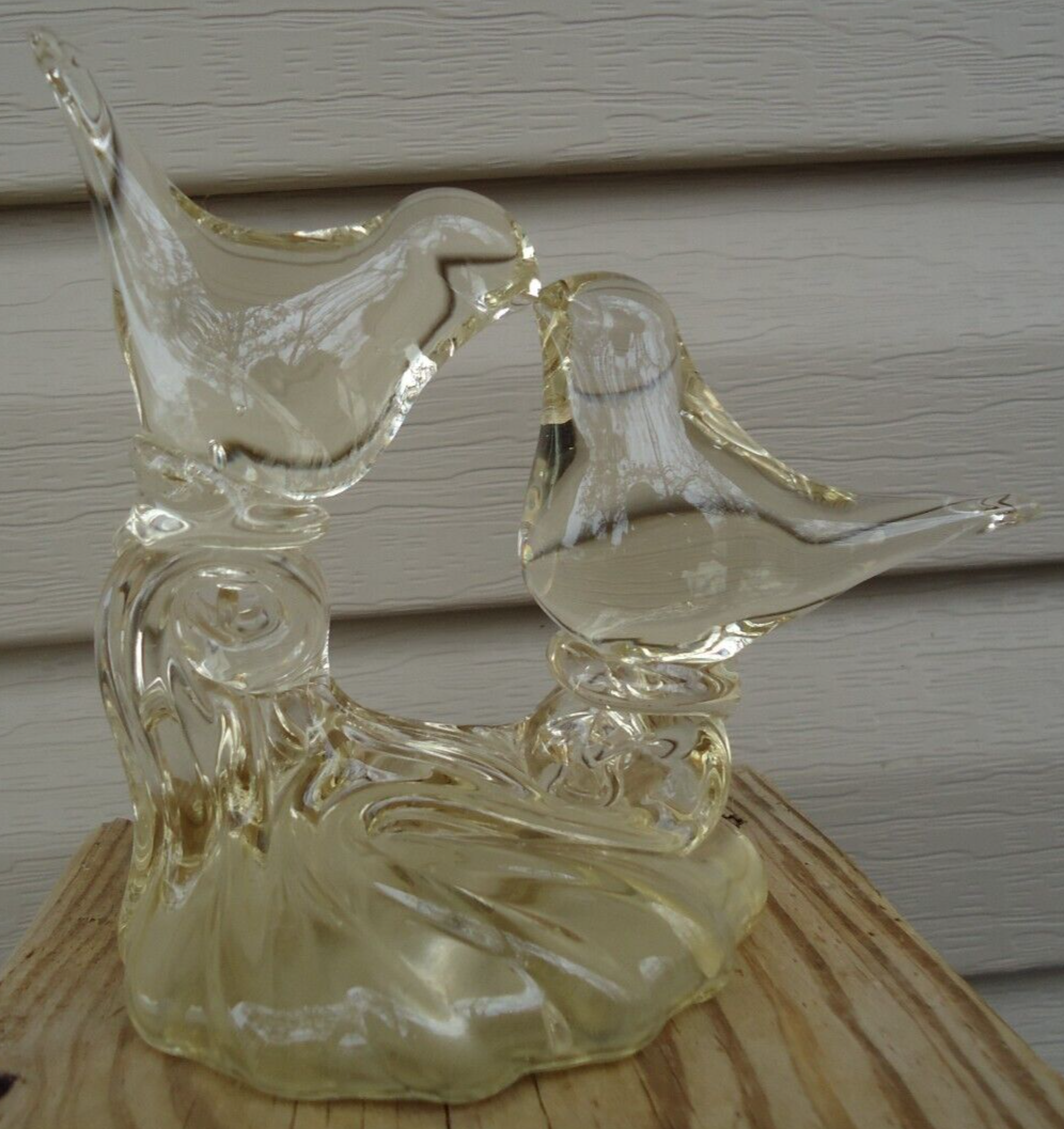 Kissing Love Birds Art Glass Sculpture Happiness Pair Signed Taug '85. Great City Traders San Francisco Made in Taiwan. Preowned excellent condition. There are some imperfections in the base but no chips or cracks. This is a slightly yellow tinted clear glass so I have shown it in multiple lighting situations. Please see all pictures for measurements. D3