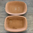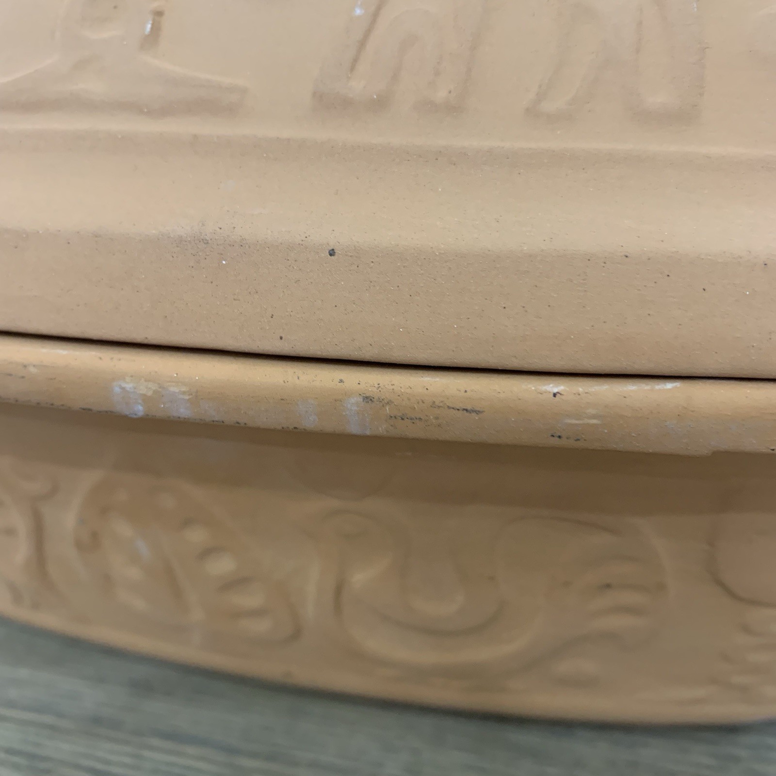 SEE PICTURES FOR SCUFF MARKS The Romertopf Clay Unglazed Baker Terracotta Covered Cooker is a two-piece set that includes a clay baker pot and lid. This oval-shaped baker is made of ceramic and features a rustic orange terracotta color. It is oven safe for use in electric, gas, and microwave ovens.