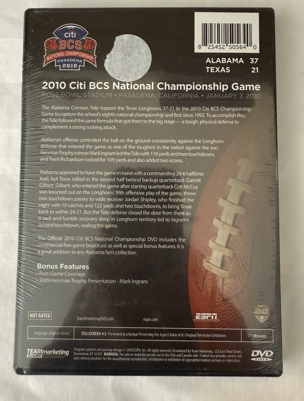 The product is a new DVD featuring the 2010 BCS Championship game between the Alabama Crimson Tide and Texas teams. This sports football DVD showcases the exciting matchup at the Rose Bowl and is formatted for Region 1 (US, Canada). With a Full Screen edition produced by Team Marketing, fans can enjoy the historic game in the comfort of their own home. This DVD is perfect for football enthusiasts looking to relive the thrilling championship showdown.