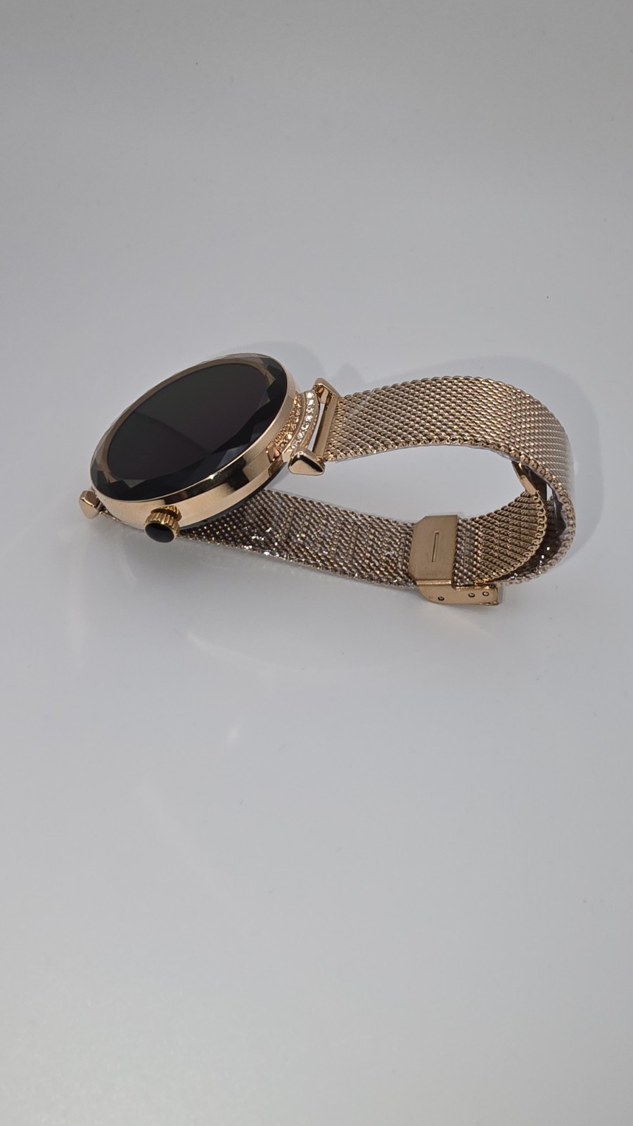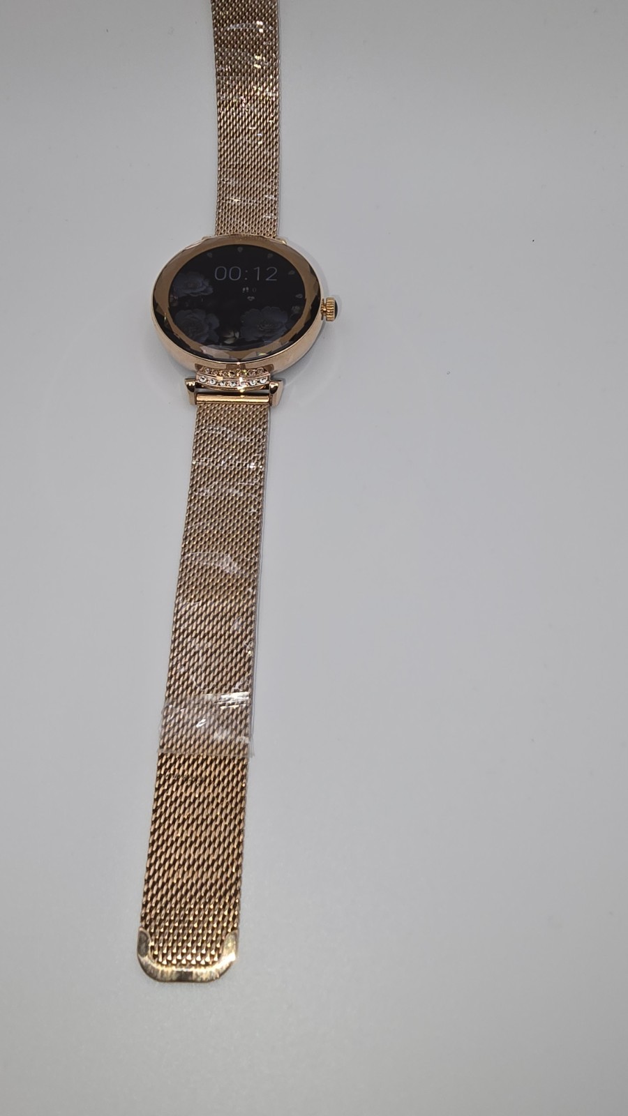 This unbranded women’s smartwatch in rose gold is a modern and elegant fitness tracker with a 1.19-inch AMOLED display and a 38mm stainless steel case. It offers essential features such as heart rate monitoring, sleep tracking, blood oxygen sensor, step counter, and message/call notifications. Compatible with both Android and iOS smartphones via Bluetooth connection. The rose gold mesh strap adds a classy, stylish touch – perfect for both everyday wear and special occasions. Includes: – Smartwatch XE20 – Magnetic charging cable – User manual – Original box Condition: Brand new, never used.