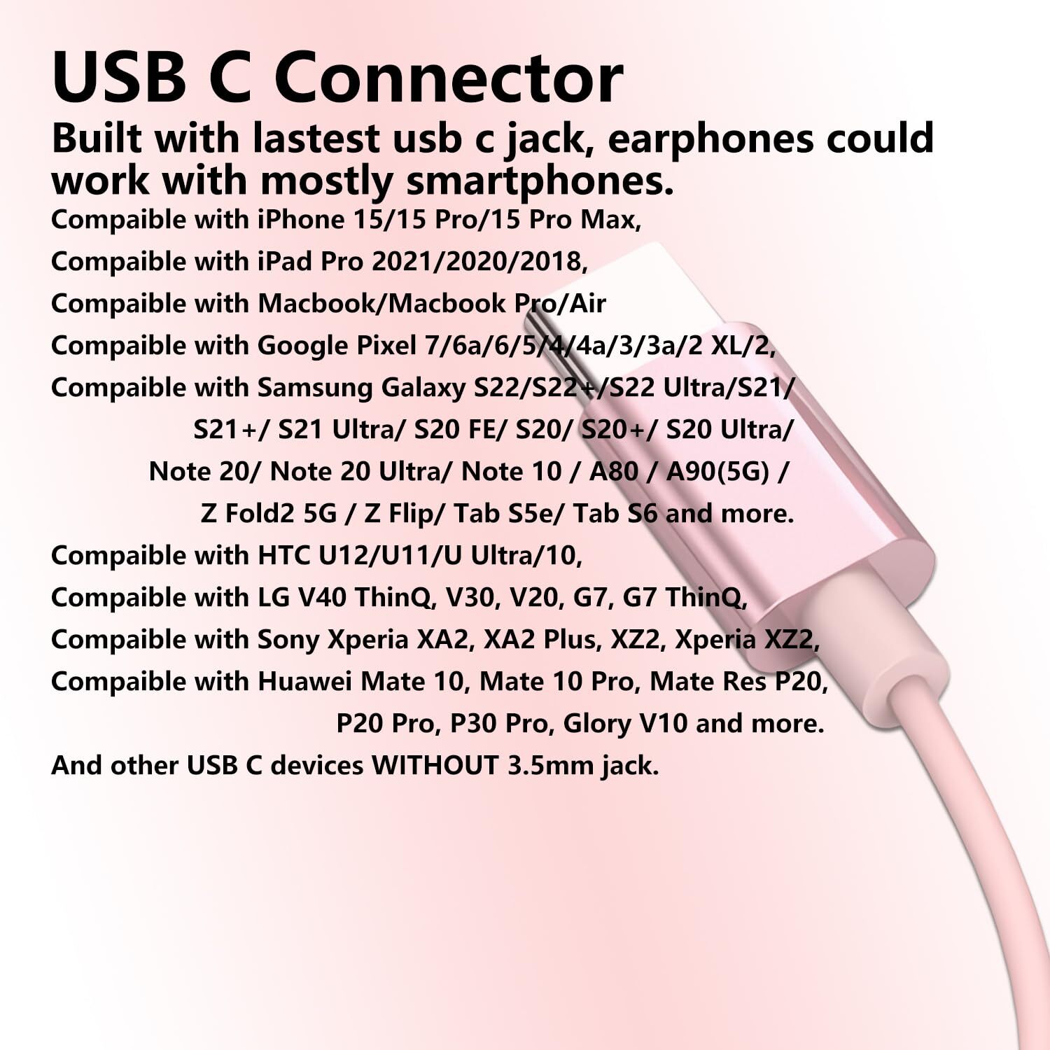 USB C Earbuds Rose Gold, Type C in Ear Headphones Wired, Stereo Bass Pink Earphones with Micphone and Volume Control Compatible with iPhone 15 Samsung Google Pixel Smart Phones 【Ergonomic Earphones】 In ear ergonomic design, the small earphones will stay fit and secure into your ears, reducing discomfort in a long time wear. Ideal for working, studying, traveling, sleeping, running, gym exercises or other outdoor activities. Totally three sizes eartips S/M/L, comfortable fit to ears. 【HiFi Stereo Earbuds】 Built in latest DAC chip, giving you the high resolution output lossless audio, no buzzing or any other bad audio. Plug to the usb c device with the earbuds, enjoy your personal music world. 【No mess Headphones】Made with high quality TPE material 3.9 feet headphones wire, the headphones won't easy to mess, less break and durable for daily use. The lines could easily throught your backpack and clothes in outdoor activities. 【Remote Control】 The Earbuds built with microphone and volume control, support music and call contorls on phones, such as answer/reject phone calls, play/pause songs, skip next/previous song, volume +/-...easily access control phones on the go. 【USB C Earbuds】 This type c headphones could work for USB C smartphones WITHOUT 3.5mm jack. Comfortable USB C Earbuds with Microphones and Volume Control Lightweight Comfortable The earbuds naturally fit to ear canal with ergonomic design, it won't press your ear and not fall. In-ear headphones with microphone Connector: USB C Cable Length: 3.9-Ft Smart Button Control Answer/End call: One press Reject call: Long press Play/Pause song: One press Previous song: Triple press Next song: Double press What Include USB C Earbuds x 1 Shipping We offer FREE shipping on all orders! We ship within Three business days of payment, usually sooner. We use a selection of shipping services such as UPS, FedEx, USPS etc. We only ship to the lower 48 states, no APO/FPO addresses or PO Boxes allowed. Local pickups and combined shipping options are not provided at this time. Return You can return a product for up to 30 days from the date you purchased it. Any product you return must be in the same condition you received it and in the original packaging. Please keep the receipt. Payment We accept payment by any of the following methods: PayPal Please pay as soon as possible after winning an auction, as that will allow us to post your item to you sooner! Feedback Customer satisfaction is very important to us. If you have any problem with your order, please contact us and we will do our best to make you satisfied. Contact Us If you have any queries, please contact us via ebay. We usually respond within 24 hours on weekdays. Please visit our eBay store to check out other items for sale! Thank you for shopping at our store.