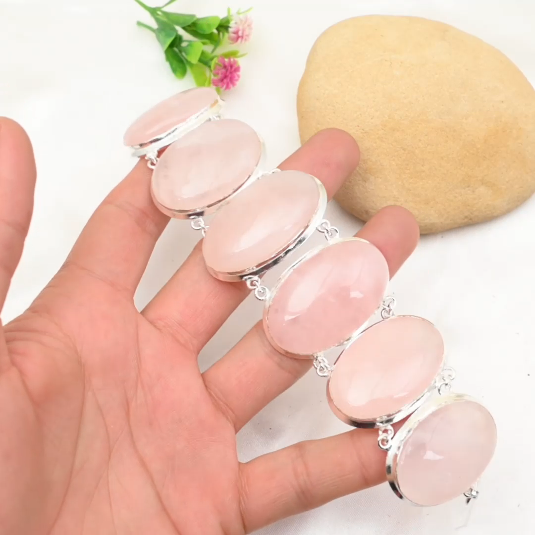 Main Stone Shape:OvalMain Stone Creation:NaturalCountry/Region of Manufacture:IndiaCountry of Origin:IndiaCollection:HandmadeMain Stone Depth:N/ATheme:Beauty, Bohemian, Ethnic, Halloween, LoveSetting Style:BezelCertification:N/ABase Metal:Sterling SilverChain Type:N/AShape:Same As PictureNumber of Diamonds:N/AMetal:Sterling SilverOccasion:Anniversary, Birthday, Christmas, Engagement, Mother's Day, Valentine's Day, WeddingFeatures:AdjustableMaterial:GemstoneTotal Carat Weight:10 carat and aboveMain Stone Width:N/ASecondary Stone:Rose QuartzMain Stone Treatment:Not EnhancedClosure:ToggleType:BraceletItem Length:8 inches with Adjustable ChainMain Stone:Rose QuartzBrand:HandmadeColored Diamond Intensity:N/AMain Stone Color:PinkDiamond Color Grade:N/AMain Stone Length:N/AColor:SilverDiamond Clarity Grade:N/AStyle:ChainCut Grade:ExcellentCharm Type:Same As PictureMetal Purity:925Number of Gemstones:6