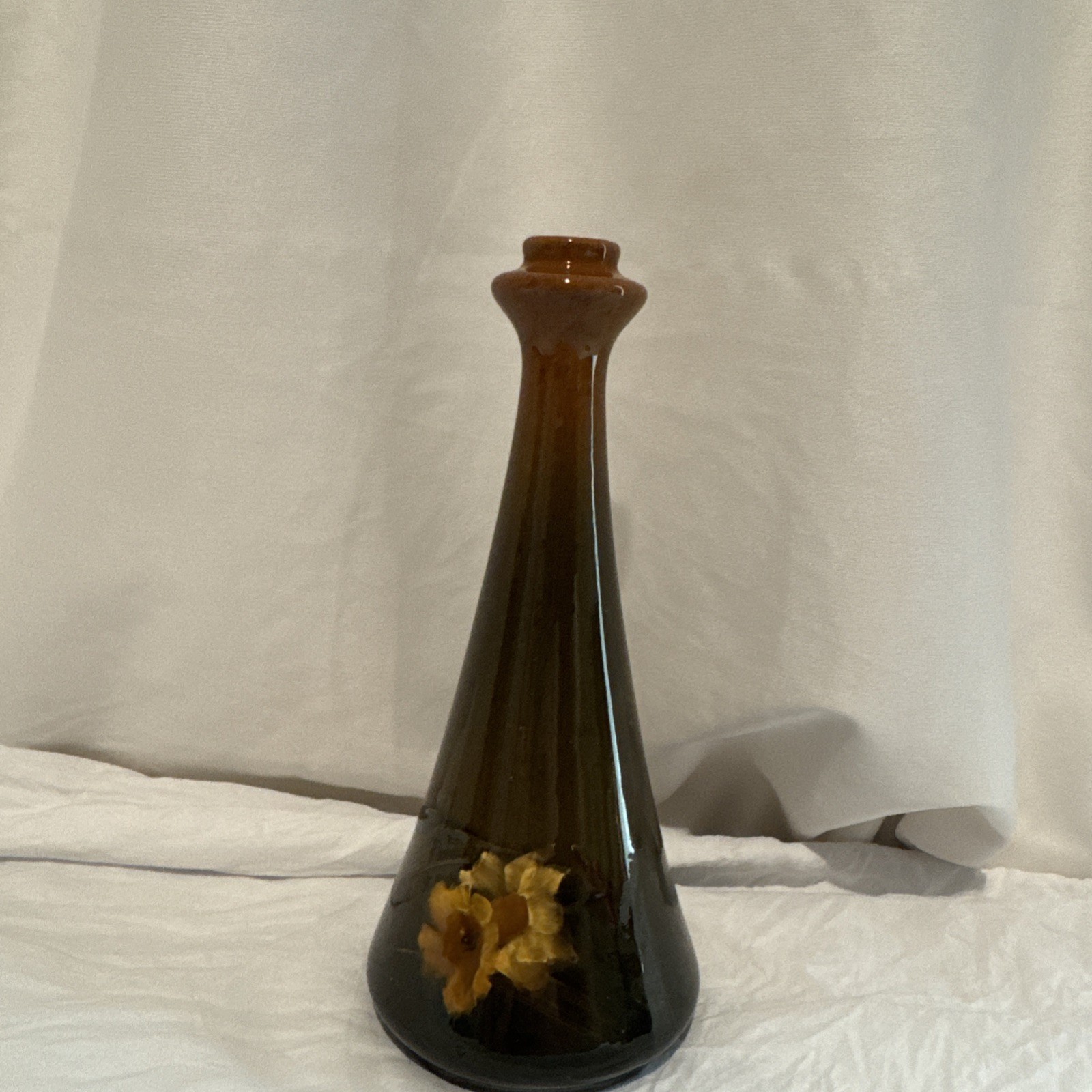 The Roseville-Rozane Royal #983-8” Daffodil Bud Vase is a vintage piece of Arts & Crafts/Mission style pottery hand-painted with a floral daffodil pattern in a glossy finish. Signed by Gussie Gerwich, this original piece from 1900 is a unique piece of North American art pottery, showcasing a vibrant burnt umber fade to dark earth color palette. Made of clay in the United States, this vase is a beautiful example of Late Victorian-era craftsmanship, perfect for collectors of vintage pottery and floral-themed decor. No damage, no repairs. Small crazing under flash. Can’t see with the naked eye.
