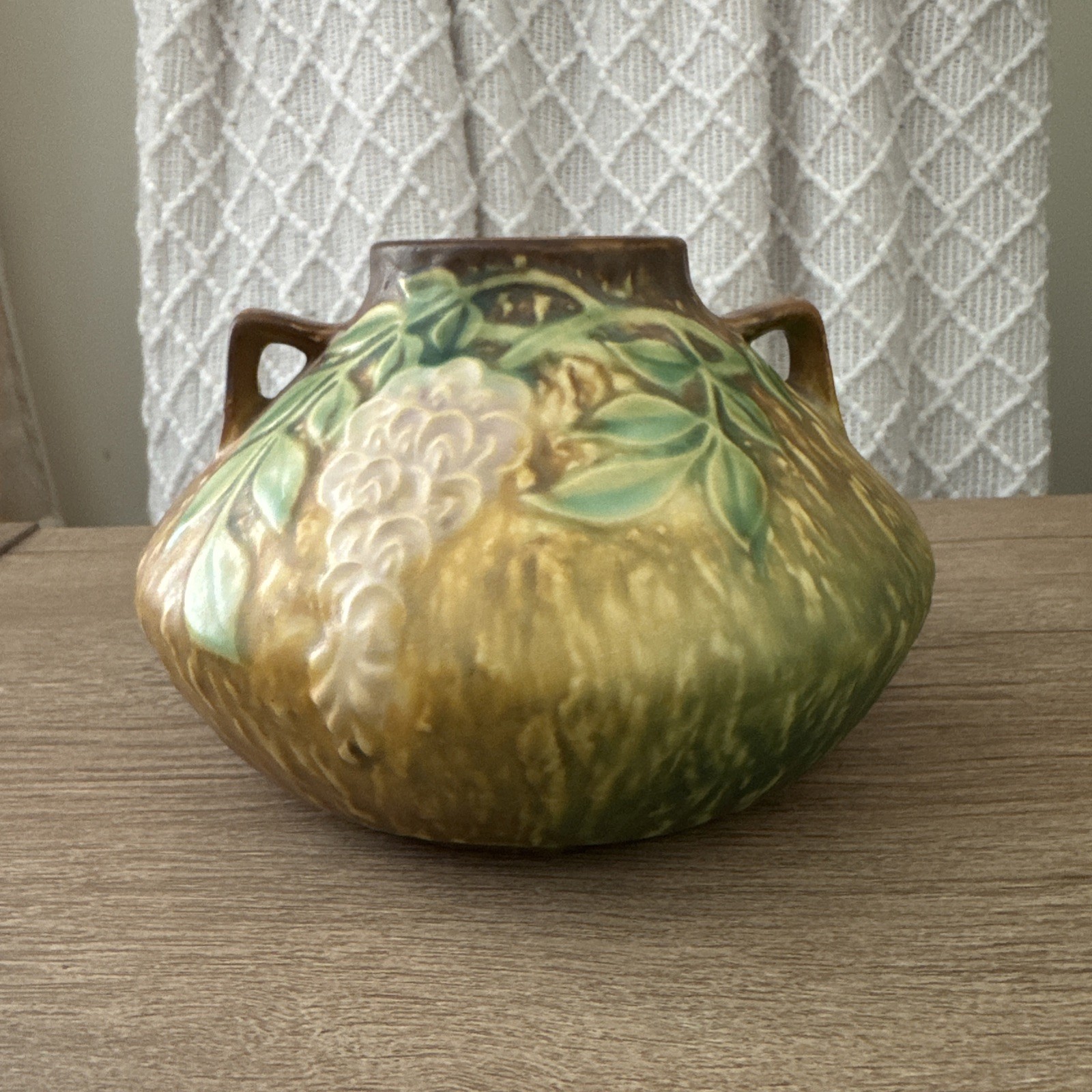 The Roseville Wisteria #629 4' Squat Vase is a vintage piece from 1933, originating from Ohio North America. Made of clay, this inkwell-style vase features a floral pattern in soft brown, tan, and green colors with a touch of soft lavender. With an arts and crafts/mission style, this decorative item stands at 4 inches tall and is part of the Wisteria product line by Roseville. Handmade with a low luster finish, this antique vase showcases the intricate design and craftsmanship of the early 20th century. No damage, no repairs, no flaking or crazing.