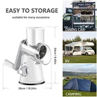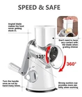Your go-to solution for hassle-free meal prep: Our three in rotary cheese grater is the perfect tool for versatile, effortless grating and slicing. Simply turn the handle, you can easily get grated pound cheese in minute Versatile kitchen tool with three blades: slicing, coarse shredding and fine shredding blade. By changing the blades you can get different shapes of food to meet your daily kitchen needs. Free your hands, no direct with blades in use Selection all kinds of recipes effortlessly: Great for potato, radish, carrot, cookie, chocolate, cauliflower, peanuts, walnuts and more for pizza toppings, salad, hash brown, cauliflower rice, dessert and more Humanity design round cheese shredder: An enlarged suction cup keeps the vegetable grater firmly attached to the smooth and clean countertop, which keeps it stable while grating. Blades dishwasher safe. All detachable design for easy cleaning Must-have cheese slicer: Manual operation. Say goodbye to annoying charging cord. No electricity needed give you a quieter using process. Make your cooking experience more efficient to eliminate tedious hand chopping