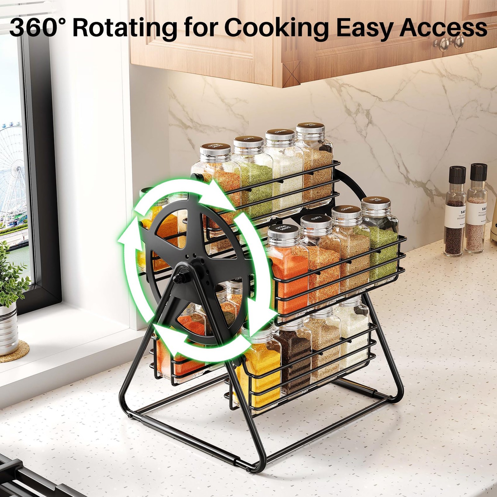Rotating Spice Rack Organizer with 20 Empty Thicken Glasses Jars and Labels for Kitchen Countertop, Spinning Like Ferris-Wheel, Metal (M) New Design Ferris-Wheel Style for Your Kitchen: The rotating spice rack adds a playful, modern look to countertops, making your kitchen feel cozy and unique. Comes with 20 Empty Thicken Glasses Jars & Tons of DIY Labels: The jars are a nice heavy-duty glass, and they hold a lot - much more than most standard spice jars, so you should be able to transfer the contents from your commercial jars pretty easily. Especially with the included funnel. Tons of stickers are included with just about any spice or herb name you can imagine, as well as blanks for you to make your own custom label with the marker pen included. Smooth Spinning That Feels Like a Fun: Turn the spinning spice rack with a gentle push and enjoy the fun of finding your 20 spice jars. Bottles Stay Upright: The rotating spice rack organizer has tall edges and a gravity-centered design, keeping bottles vertical, even when spinning. Safer than a wobbly round rotating spice rack. Easy Assemble:Institutions were very easy to follow. Easy to put together. It tooks 5 minutes assemble and it was ready to start putting spices in. Enjoy the new concept of rotating the spice rack.