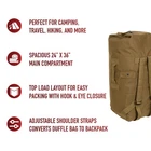 Rothco Coyote Brown Double Strap GI Type Duffle Bag 2684. Rothco Enhanced Double Strap Duffle bag is made of heavyweight 1000 denier nylon material. This Duffle Bag can be carried by the heavy duty side handle or comfortably worn on the back thanks to the padded double straps. Features 2 adjustable shoulder straps, 1 side handle on the bag for easy carrying, 1 button closure accessory pocket in the middle of the bag. Top of bag has a snap hook closure. Measures 24" x 36.