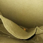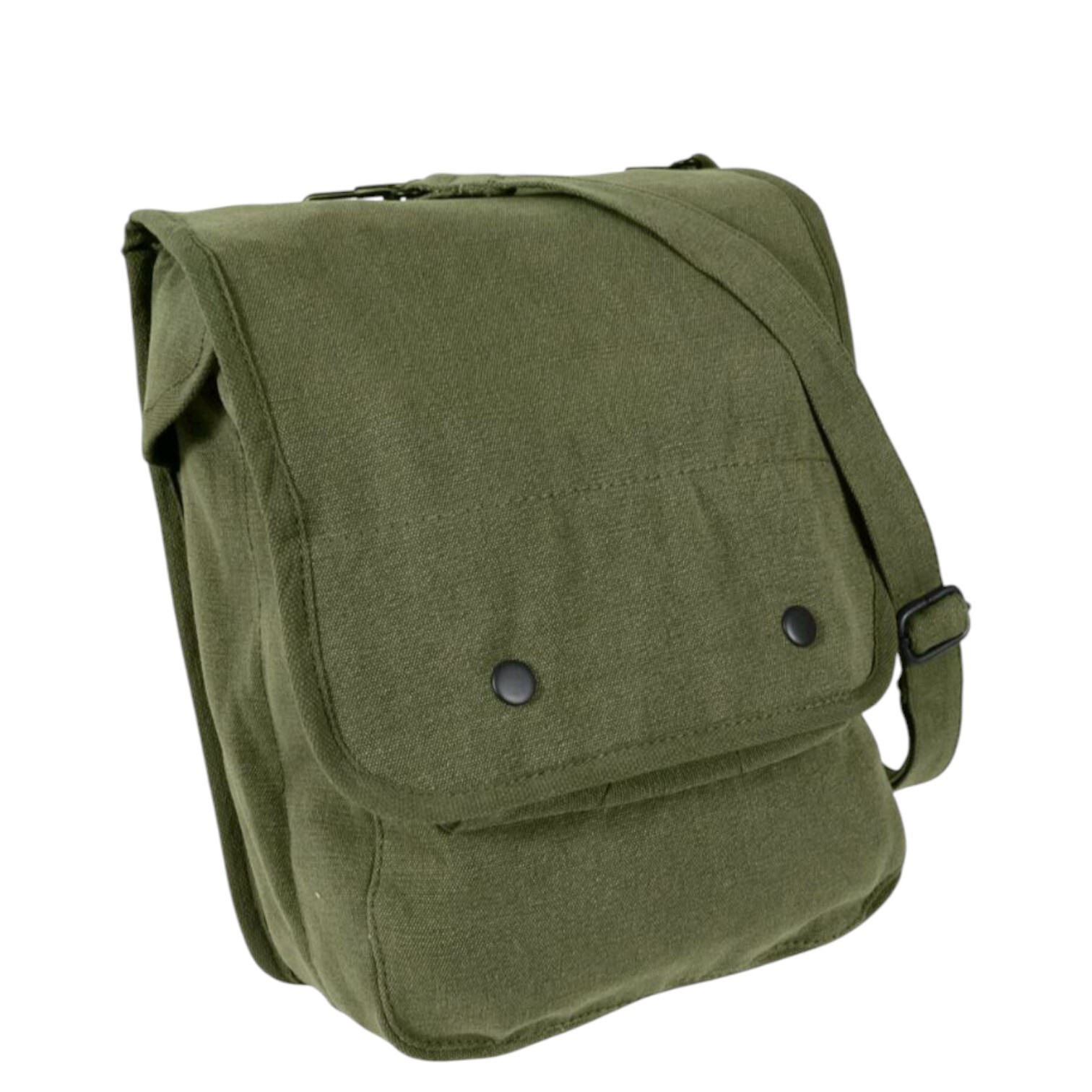 * loose thread on bottom (last pic) Smoke-free petfree Adjustable and removeable strap Two snap closure Outer pockets under flap Clean in and out Interior has 2 sections Dimensions 12" x 8.5" x 4.5" Best color description army green