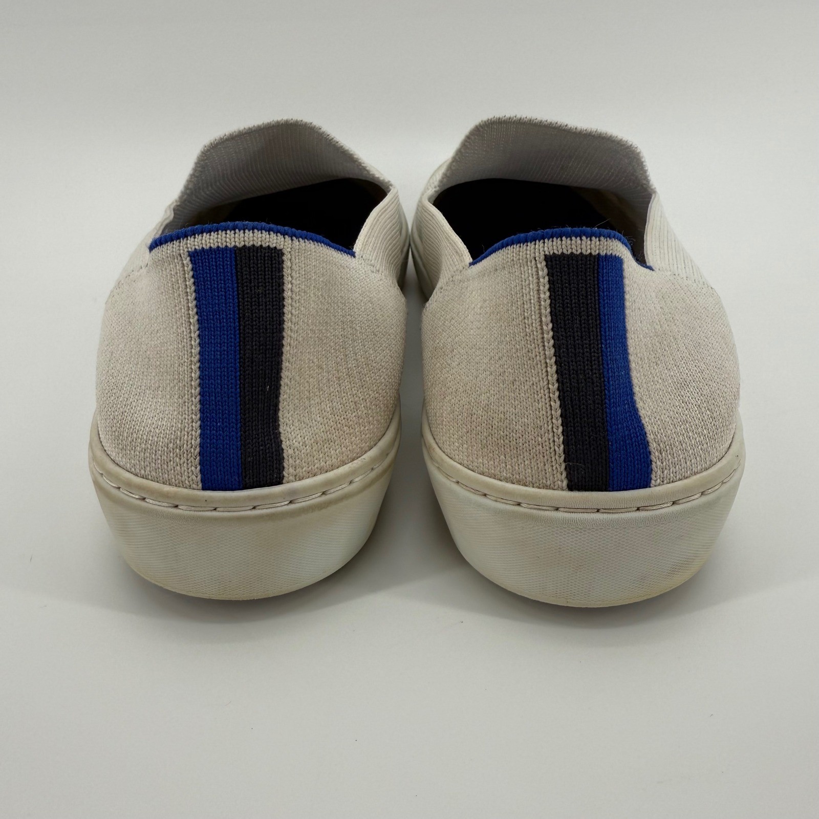 Preowned, see photos for signs of wear. Needs stain treatment. Contemporary slip-on sneakers by Rothy's, noted for their comfort and eco-friendly design, deliver a chic and casual option. These sneakers showcase a sleek, minimalist silhouette in a versatile white knit, complemented by a comfortable slip-on design. The sneakers feature a rounded toe, a cushioned insole, and a durable rubber sole, providing both style and practicality. Accented with a subtle blue and black stripe at the heel and blue interior lining, these shoes add a touch of visual interest, making them a fashionable choice for everyday wear. Department: Women Color: White UK Shoe Size: 6.5 Model: Rothy's The Sneaker Upper Material: Knitted Features: Comfort, Cushioned, Breathable, Slip-on, Lightweight Style: Sneaker Character: Minimalist EU Shoe Size: 40 Type: Athletic Release Year: 2019