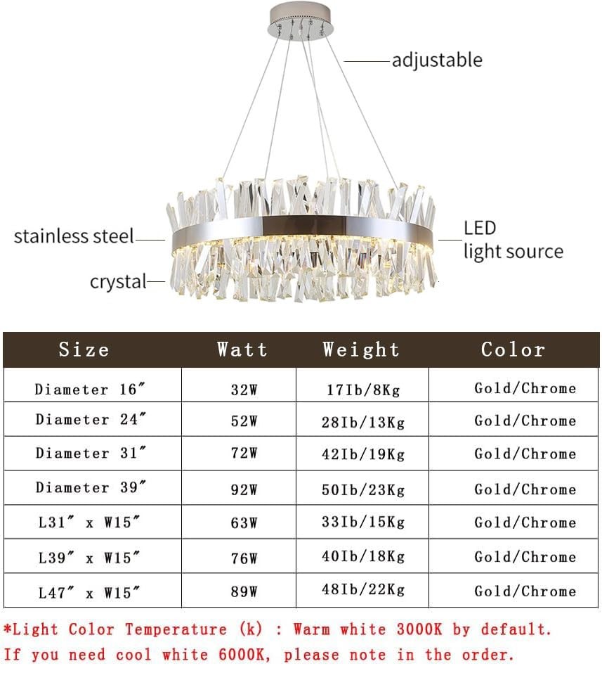 Elevate your living space with these stunning round crystal chandeliers, offering a luxurious touch to any room. Crafted from stainless steel and adorned with sparkling crystals, these hanging lamps emit a warm 3000K LED light, creating a cozy ambiance. With adjustable suspension cables, they are suitable for both high and low ceilings. Available in chrome and gold finishes, and sizes ranging from 16 inches to 39 inches round or 32 to 39 inches rectangular, you can find the perfect fit for your home, kitchen, or dining room. Easy to install and maintain, these chandeliers are a sophisticated addition to your decor. Elevate your space with elegance and radiance. Luxury Drum Chandelier: This stunning modern LED chandelier is an excellent complement to the best of today's interior design fashions. These luxury crystal chandeliers are available in gold and chrome finish. Designed with a polished steel finish and crafted from high-quality stainless steel and crystal, this chandelier adds a touch of elegance and modern style to your home. Warm Lighting: Featuring a 3000K warm light LED chips for energy efficiency, these fixtures create a cozy and inviting ambiance. Wire Can Adjustable: The wire is 59 inches long and adjustable, making this drum crystal chandelier suitable for high and low ceilings. Versatile Sizing: These luxury crystal chandeliers are available in gold and chrome finish. And available in six sizes ranging from round 16 inches, 24 inches, 31 inches, 39 inches and rectangular 31 inches, 39 inches, suitable for various room sizes and occasions. Suitable for living room, bedroom, dining room and kitchen island. Easy installation and Maintenance: This round chandelier with a flush mount design for hassle-free installation and maintenance.