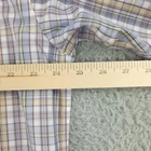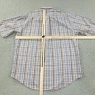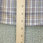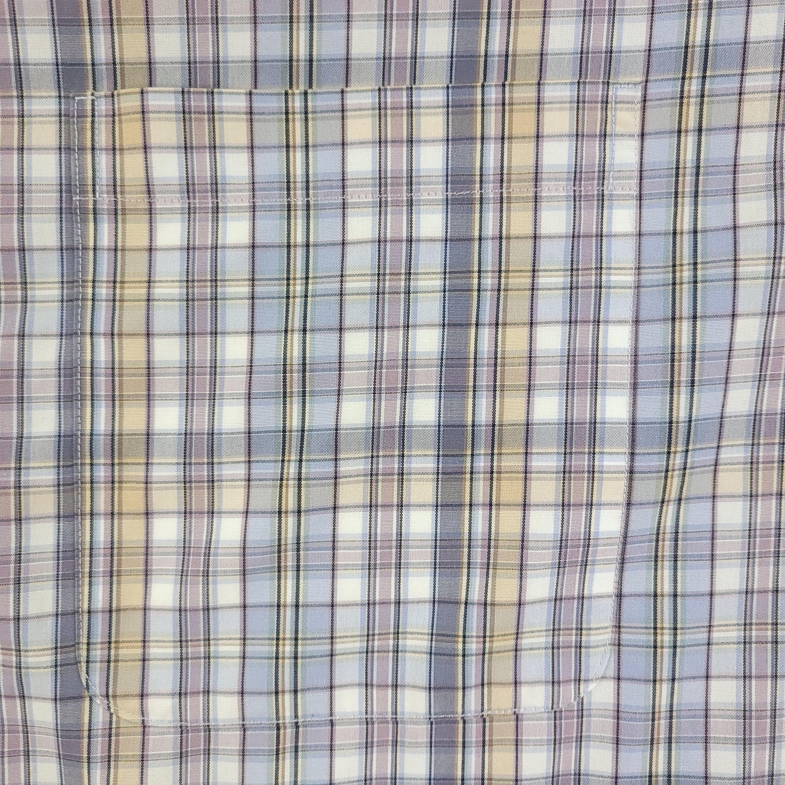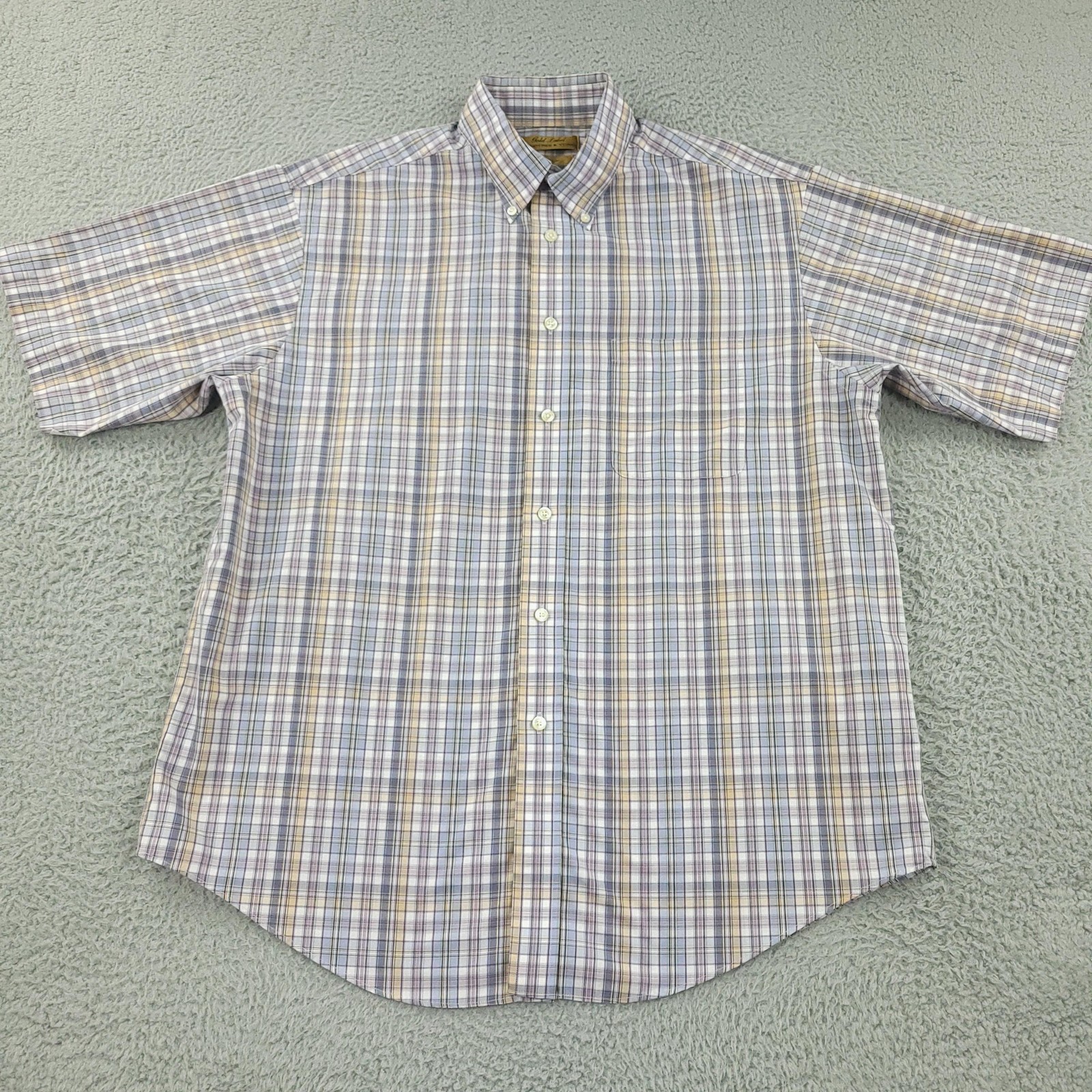 Brand: Gold Label Roundtree & Yorke Style: Mens short sleeve button-front shirt with button-down collar and single chest pocket. Pattern: Multicolor plaid in light blue, tan, white, and purple tones. Size on tag: Large Material: 100% cotton; non-iron fabric; made in China. Details: Button-down collar, full button front closure, chest pocket, curved shirttail hem, lightweight woven fabric. Washed and dried with Fragrance Free Detergent & Dryer Sheets. Measurements are included in the photos, compare measurements with your item to ensure proper fit. (Measurements are done with the item lying flat). I ship next business day and all items include tracking. Items are added daily to my store Visit My Store Buy More & Save! Combined shipping for US customers - $1.99 for each additional item (Add items to shopping cart and discounts will automatically calculate during checkout)