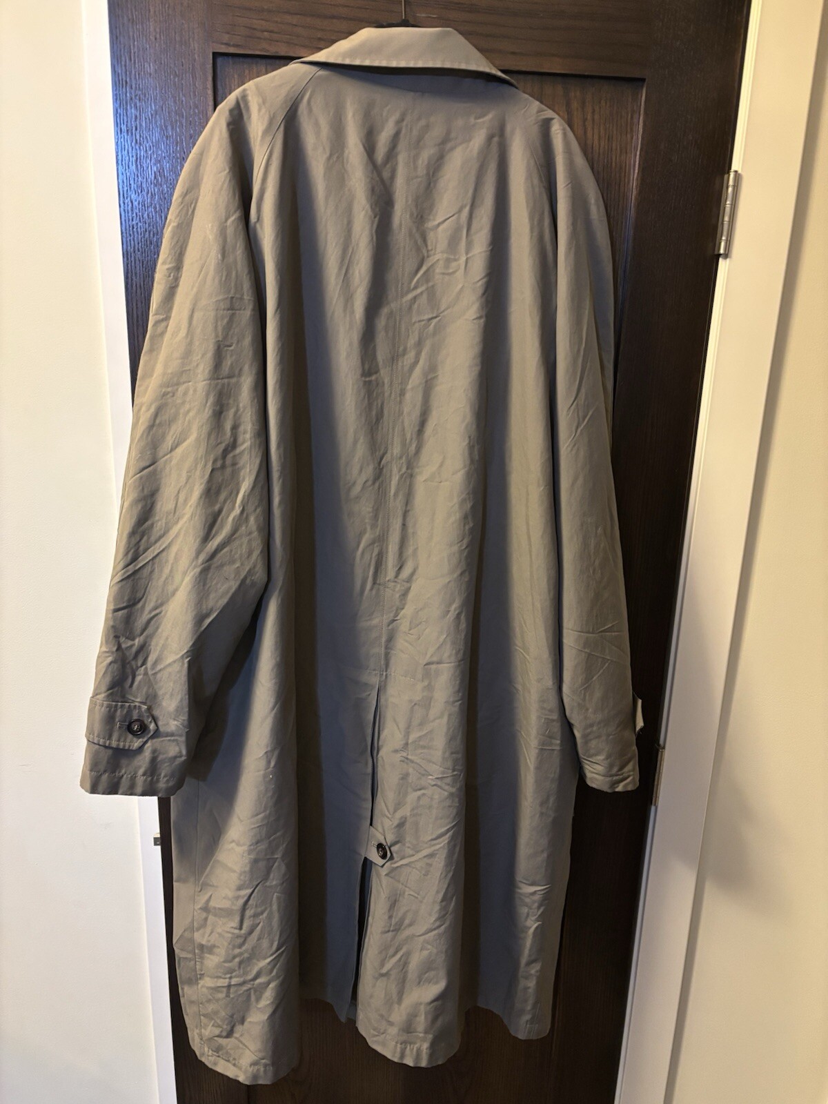This Roundtree & Yorke Rainwear Coat in size 50 is a stylish outerwear piece for men. The coat features an olive green microfiber outer shell with a zip closure and button accents. It is designed with a practical zip-out liner, making it versatile for different weather conditions. This rain coat combines functionality with a classic style, ideal for staying dry and stylish during rainy days.