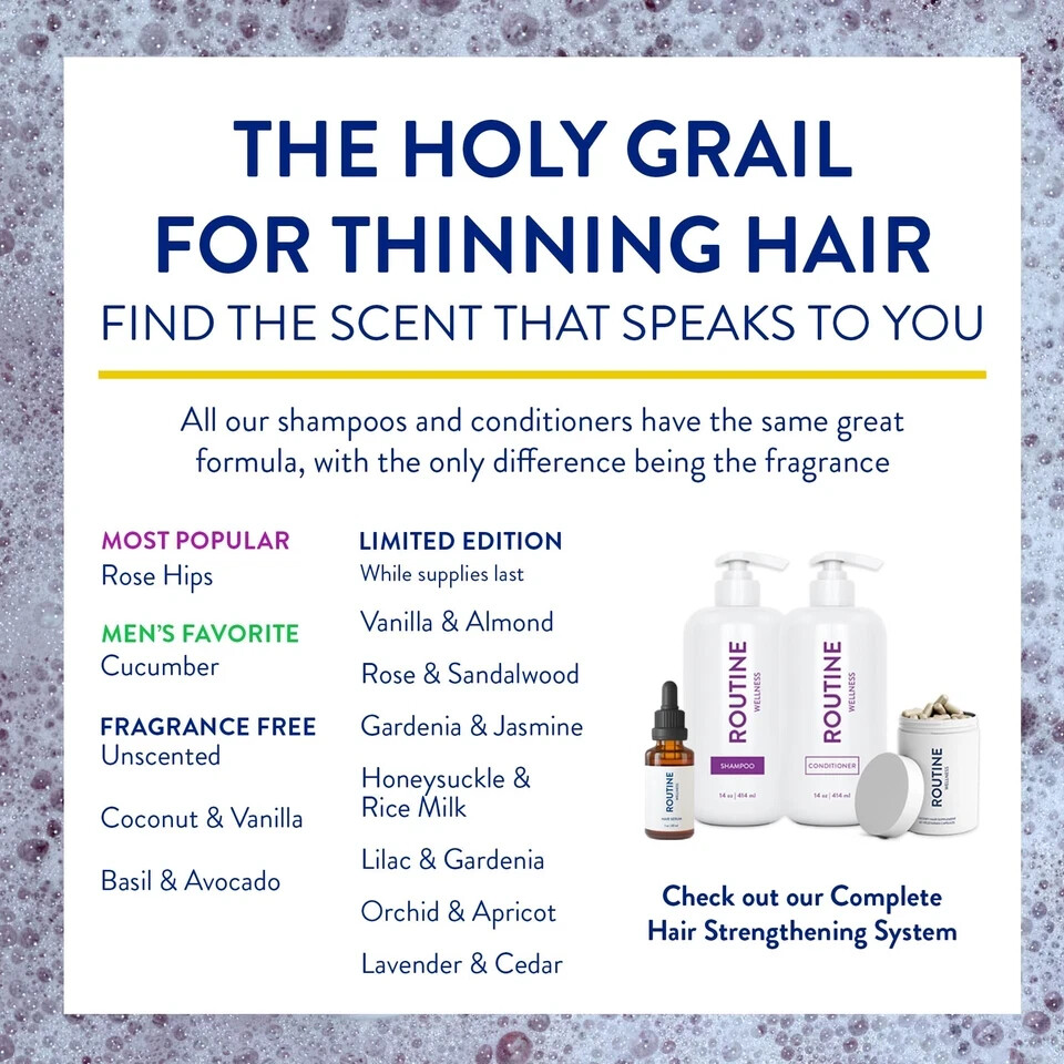 Routine Wellness Anti-Thinning Shampoo and Conditioner Set for Thinning Hair ... BIOTIN SHAMPOO AND CONDITIONER: Our biotin hair strengthening shampoo and conditioner set for women and men is designed to combat hair thinning. Enriched with biotin and saw palmetto oil (a DHT blocking ingredient), argan oil, nettle oil and other premium ingredients, our shampoo will provide you the essential hair vitamins for stronger, fuller-looking hair. ROUTINE WELLNESS SHAMPOO AND CONDITIONER SET: Infused with hair strengthening ingredients for women and men, Routine Wellness Shampoo and Conditioner reduces thinning caused by breakage, ensuring your hair feels stronger and fuller with our best shampoo and conditioner. SULFATE FREE & COLOR SAFE FOR THINNING HAIR: Preserve your hair color while nourishing each strand with our sulfate free shampoo and conditioner. This gentle yet effective formula is perfect for color treated hair, offering a safe choice for your hair strengthening product. HAIR LOSS TREATMENTS FOR WOMEN: Explore effective hair thinning treatments with our biotin shampoo for women and men. This hydrating shampoo and conditioner set is cruelty-free, sulfate free, vegan and contains no parabens, silicon, gluten, or SLS that could interfere with hair growth. HEAVENLY SCENTS: Shampoo and conditioner sets with delightful scents that leave your hair smelling fresh while deeply moisturizing and softening. Perfect for all hair types including dry hair, color treated hair, thin hair, damaged hair and normal hair. Shipping We offer FREE shipping on all orders! We ship within Three business days of payment, usually sooner. We use a selection of shipping services such as UPS, FedEx, USPS etc. We only ship to the lower 48 states, no APO/FPO addresses or PO Boxes allowed. Local pickups and combined shipping options are not provided at this time. Return You can return a product for up to 30 days from the date you purchased it. Any product you return must be in the same condition you received it and in the original packaging. Please keep the receipt. Payment We accept payment by any of the following methods: PayPal Please pay as soon as possible after winning an auction, as that will allow us to post your item to you sooner! Feedback Customer satisfaction is very important to us. If you have any problem with your order, please contact us and we will do our best to make you satisfied. Contact Us If you have any queries, please contact us via ebay. We usually respond within 24 hours on weekdays. Please visit our eBay store to check out other items for sale! Thank you for shopping at our store.