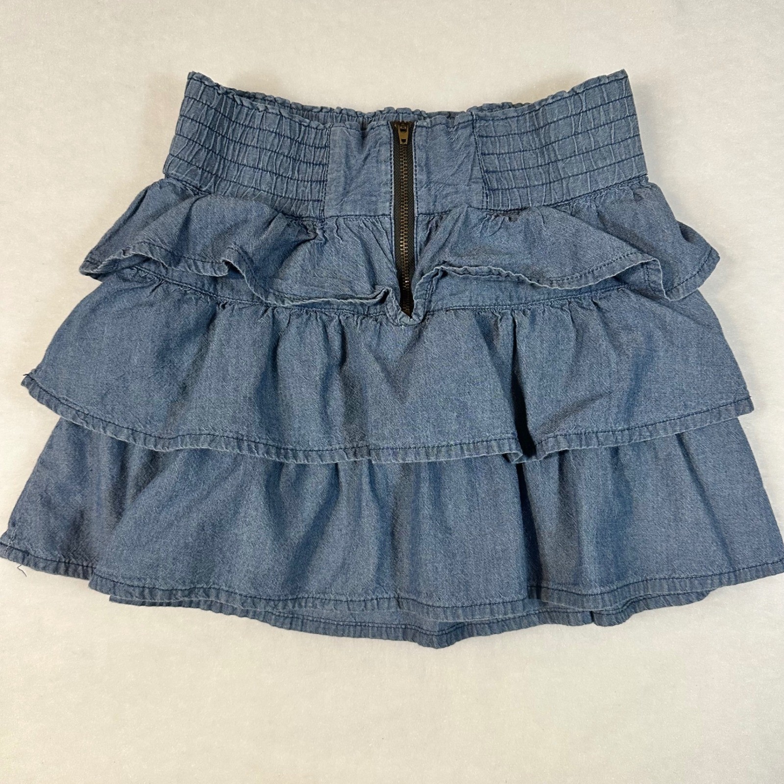 Roxy girls denim-look tiered ruffle skirt in a medium wash blue. This stylish piece features a comfortable smocked elastic waistband and a functional back zipper for easy wear. The three-tier ruffle design adds playful movement, while the lightweight fabric provides a chambray-like feel perfect for everyday styling. A subtle embroidered heart logo detail is located near the bottom hem. Measurements: • Waist: 12.5" (25" doubled) • Length: 13"