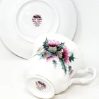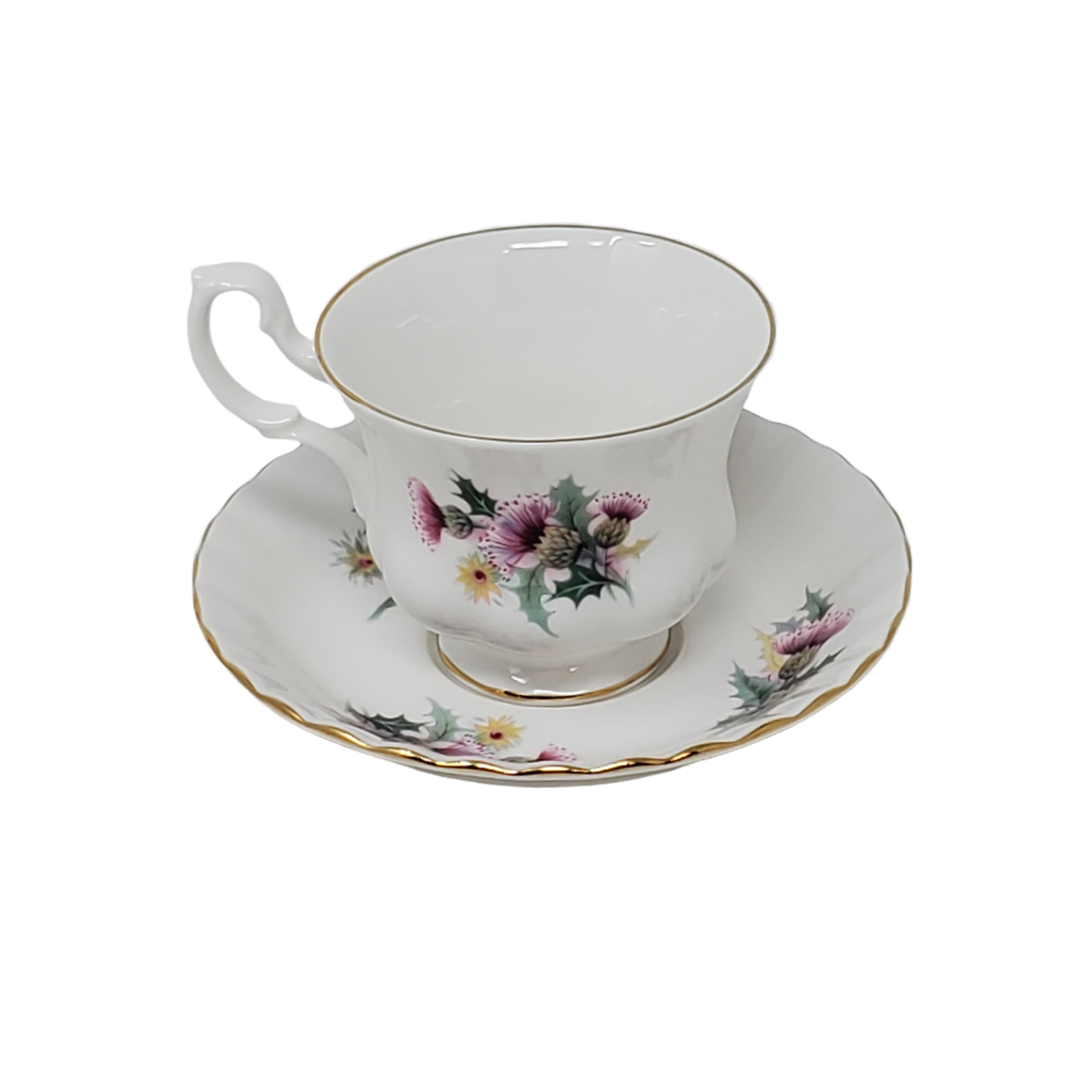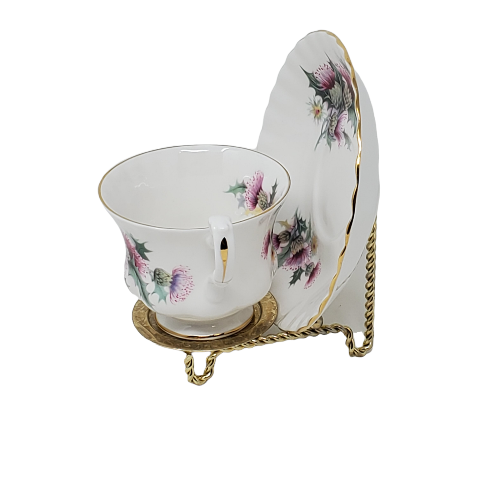Royal Albert Summertime Series, Avebury pattern teacup and saucer made from fine bone china England 1978 to 1986. This pattern features gently colored depictions of pretty purple thistle flowers in bloom on the exterior and on the interior of the cup. Maker's marks are on the bottoms of both the cup and the saucer. Manufactured in England. Please review all photos for details as part of the description. Stand Not Included.