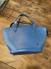 The Royal Azure Authentic Louis Vuitton Bag is a luxurious Epi leather tote handcrafted in France. Featuring the iconic Monogram pattern and a stylish blue exterior color, this designer piece is perfect for the modern woman. Made with high-quality leather materials and a convenient zip closure, this tote exudes sophistication and elegance. The luxurious Louis Vuitton Epi finish adds a touch of exclusivity to this classic tote, making it a must-have accessory for any fashion-forward individual. Note: some small imperfections in handles. Please message me if you would like additional images.