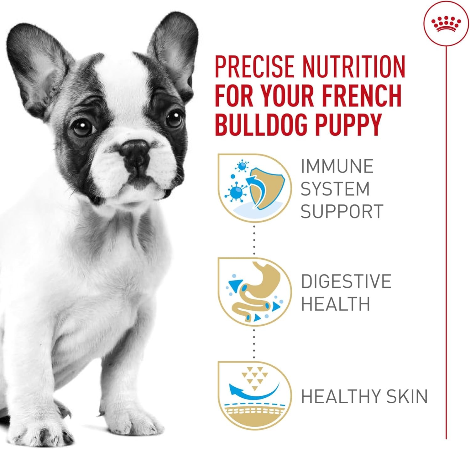 Serve up the tailored nutrition your French Bulldog deserves with Royal Canin Breed Health Nutrition French Bulldog Puppy Dog Food Dry Formula. Royal Canin makes it easier than ever to feed your puppy tailored dog food. This French Bulldog food features a customized curved-shaped kibble that is specially designed for your French Bulldog's short muzzle and jaw shape, making it easy for little dogs to pick up and chew. Not only that, but this complete and balanced puppy food provides the nutrition to help your best friend thrive. An exclusive mix of antioxidants and vitamin E in the dog kibble promotes healthy development of your puppy's immune system, while exclusive nutrients help support the skin barrier for healthy skin. Royal Canin French Bulldog food is formulated with high-quality protein and prebiotics to support digestive health and a balanced intestinal flora, contributing to optimal stool quality. Serve your French Bulldog Royal Canin Dog Food and promote your puppy's overall wellness with every meal. TAILORED NUTRITION: Check out the full range of Royal Canin wet and dry puppy food formulas that offer precise nutrition for dogs of all ages, sizes and breeds QUALITY AND SAFETY: Attention to the very smallest details helps Royal Canin deliver precise and effective health nutrition for pets MIXED FEEDING: Pairs well with Royal Canin Size Health Medium Puppy Thin Slices in Gravy Wet Dog Food DIGESTIVE HEALTH DOG FOOD: Healthy dog food helps to support a balanced intestinal flora and healthy digestion, contributing to optimal stool quality SKIN HEALTH: Exclusive nutrients help support the skin barrier for healthy skin IMMUNE SUPPORT PUPPY FOOD: Antioxidants and vitamin E in the dry dog food promote healthy development of your puppy's immune system CRUNCHY KIBBLE: Customized curved dog kibble shape specially designed for your French Bulldog puppy's short muzzle and jaw shape BREED HEALTH NUTRITION PUPPY DOG FOOD: Royal Canin Breed Health Nutrition French Bulldog Puppy Dog Food Dry Formula for purebred French Bulldogs 8 weeks to 12 months old Product Dimensions 3.5 x 13.5 x 23.5 inches; 10.5 Pounds Manufacturer recommended age 1 month and up Item model number 111109 Manufacturer Royal Canin Brand Royal Canin Flavor Chicken Age Range (Description) Puppy Item Form Kibble Specific Uses For Product Muscle Care Item Weight 10.5 pounds Manufacturer Royal Canin Item model number 111109 Item Dimensions LxWxH 3.5 x 13.5 x 23.5 inches Brand Name Royal Canin Target Audience Keyword French Bull dog Puppy Directions Royal Canin French Bulldog Puppy dry dog food is designed to meet the nutritional needs of purebred French Bulldogs 8 weeks to 12 months old Size 10.5 Pound (Pack of 1) Age Range Description Puppy Number of Items 1 Style Puppy Breed Recommendation Medium Breeds Specific Uses for Product Muscle Care Item Package Dimensions L x W x H 22.5 x 12.5 x 3.4 inches 8161174