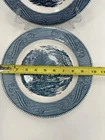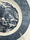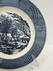 One plate has a small chip on underside edge of plate. See photos. The image shows a stack of vintage "Currier & Ives" dinner plates, specifically the "Old Grist Mill" pattern by Royal China. Key details include: Manufacturer: Royal China Company of Sebring, Ohio. Pattern: "The Old Grist Mill," featuring a blue and white winter scene. Production Era: 1949-1986. Material: Likely ironstone or ceramic. Design: Transfer-printed scene with decorative scrolls around the rim. Collectibility: A widely recognized and collectible pattern. Safety: Vintage dishware may not meet modern safety standards for food use.