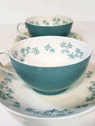 Royal Doulton April Showers Set Of 2 Tea Cups & Saucers D6435. 4 pcs 2 sets beautiful light blue color made in England . Saucers have a pattern the looks like crazing measures 6" across no chips or cracks. Tea cups are 3 3/4" across 2 1/4" tall one has a small mark on the inside see pictures it does not go all the way through besides that they are very pretty no chips or cracks .