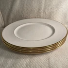Elevate your dining experience with this exquisite set of four Royal Doulton Regent dinner plates. Crafted in England from fine bone china and featuring a luxurious gold rim, these plates are perfect for any occasion, including Christmas. The contemporary style and elegant ivory color make them a beautiful addition to your table setting. Each plate in this set measures 10.75 inches in diameter, weighs 4.12 lbs, and features a printed backstamp. The glossy finish and decorative design add a touch of sophistication to your dining experience. Whether you're hosting a formal dinner party or enjoying a casual meal with family, these plates are sure to impress. Excellent condition. Just like new. No chips or cracks.