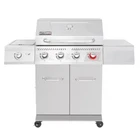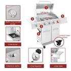 Royal Gourmet Stainless Steel 4-Burner BBQ Cabinet Style Propane Gas Grill 54000 BTU Grill for Perfect Patio Garden Picnic Backyard Abundant Cooking Space: 632 square inches cooking area at a total comprises 483 sq. in. stainless steel cooking grates and 149 sq. in. chrome-plated steel wire warming rack, which fits for cooking 15 hamburgers at the same time. High-powered Burners: This stainless steel gas grill has 3 main burners (10,000 BTU each), a sear burner (14,000 BTU) and a lidded side burner (10,000 BTU). 5 burners deliver a total of 54,000 BTU cooking power. Easy to Ignite: Reliable electronic ignition system offers quick startup with a simple push and speeds up the inner heat delivery instantly. Easy to Clean: The cabinet style gas grill grease management system including removable grease tray and grease cup is designed to collect residues and drippings for mess-free cleanup. No Flare-ups: The stainless steel flame tamers distribute even heat to every inch of cooking grates and create barriers between food and flames for preventing the risks of flare-ups. Additional Prep Space: Side table on the right side offers more preparation space for seasonings and grilling tools; the lid of side burner functions as a table for added workspace. Insert 1 AA battery (not included) into the ignitor. Recommended grill cover: Royal Gourmet CR5402 (Not Included)(Available in our store) PICTURE Specification Primary cooking space: 27.56"L x 17.52"W Warming rack area: 25.20"L x 5.91"W Product size: 52.95"L x 25.00"W x 45.67"H Package size: 31.89"L x 27.17"W x 20.87"H Color: Silver Material: Stainless steel; Steel Net weight: 87.1 lb. Gross weight: 103.4 lb. Royal Gourmet® GA4402S STAINLESS STEEL GAS GRILL One of the things I love most about this grill is the endless cooking possibilities.There is nothing restrained about the drool-worthy barbecue grilling, just get this exclusive appliance to celebrate the arrival grilling season by kicking off an enthusiastic BBQ party, serve your family and friends the incredible yummy foods with Royal Gourmet. OUR STORY STARTS HERE We always chase great flavors. From good meals to good times, we're driven by our passion for BBQ. Our shared love of food deepens our bonds with our friends and family inspiring us to do our best every day. Savor every moment and have fun with Royal Gourmet® . SAUTEING FLAVOR OR SAUCE PREP Saute small side dishes with hot oil until fragrant, set aside for your family members and friends. Or, stir the sauce on the pot and spoon it over the meat for best flavor with versatile side burner of GA4402S Gas Grill. Side Dishes Helper 10,000 BTU side burner lays flush with the primary cooking area and contributes to great convenience for side dishes prep simultaneously. The folding lid functions as a cover for protection and also as a side table for workspace. Ample Work Space Sturdy side table on the right side of the grill accommodates a raft of grilling accessories and seasonings within arms’ reach, avoiding the big hassle of cooking in a rush and getting into a muddle during the consistent grilling. Grease Management System Removable grease tray and grease cup are designed to collect residues and drippings for preventing the risk of flare-ups and helping do the hassle-free cleanup after use. Electronic Ignition System Reliable push-to-start electronic ignition makes five stainless steel burners spark up in no time. You are ready to cook delicacies in a minute. Lid-mounted Thermometer The built-in thermometer gauge monitors accurate temperature in actual time and helps you control the performance at will. Stainless Steel Primary Cooking Grates In addition to the heavy-duty double-layer lid, the same high-quality 483 sq. in. of stainless steel cooking grates and the 149 sq. in. of chrome-plated steel wire warming rack also make a deep impression.