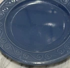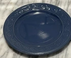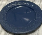 The Royal Norfolk Salad Plate is a 7.5-inch round ceramic plate in a contemporary style, featuring a glossy finish with an embossed blue pattern. This decorative plate from the Banquet product line is intended for all occasions and is hand wash only. The plate is an original piece of art pottery from Royal Norfolk, manufactured in 2024 in China, bearing an impressed backstamp. Please note that some scratches have been observed on the plate.