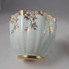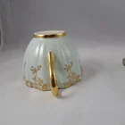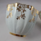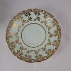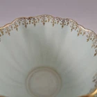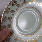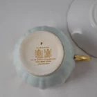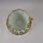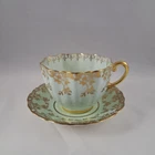 This elegant tea cup and saucer is a stunning vintage piece with a light powder blue or green finish and delicate gold filigree detailing. The double mark for HM Queen Mary adds historical charm, though it shows signs of age with crazing and a faint crack. Perfect for collectors who appreciate timeless beauty with a touch of character!