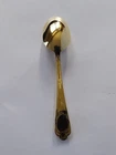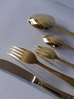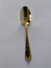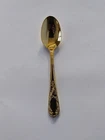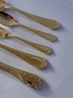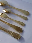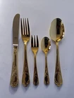 The Royal Solingen 23/24K HARTVERGOLDET Germany Gold Plated Utensils set includes 5 pieces made in Germany. Each piece features a luxurious gold plated design, adding a touch of elegance to the dining experience. The set includes a knife, teaspoon, spoon, and forks, all part of a Royal theme, perfect for a service for one. These original replacement pieces are a stunning addition to any collection or dining table, showcasing craftsmanship and quality from the Royal Solingen brand. One knife Two different Spoons Two different forks As shown in the pictures. These Utensils are very nice but may have some lite wear from use. Big spoon has a small blemish on the bottom shown in the last picture. No original packaging included. Please examine pictures for overall condition details. Smoke free home. Set 3