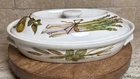 This is a gorgeous covered vegetable dish. There is a little smudging in the foot, that's about it - see photos. The sides of the dish have berries and shocks of wheat. The lid is covered with beautiful renderings of fruit. Bountiful harvest. • Length: 9 3/8 in • Height: 2 1/8 in • Special Characteristics: GLD HDLS • Porcelain • Crafted in England